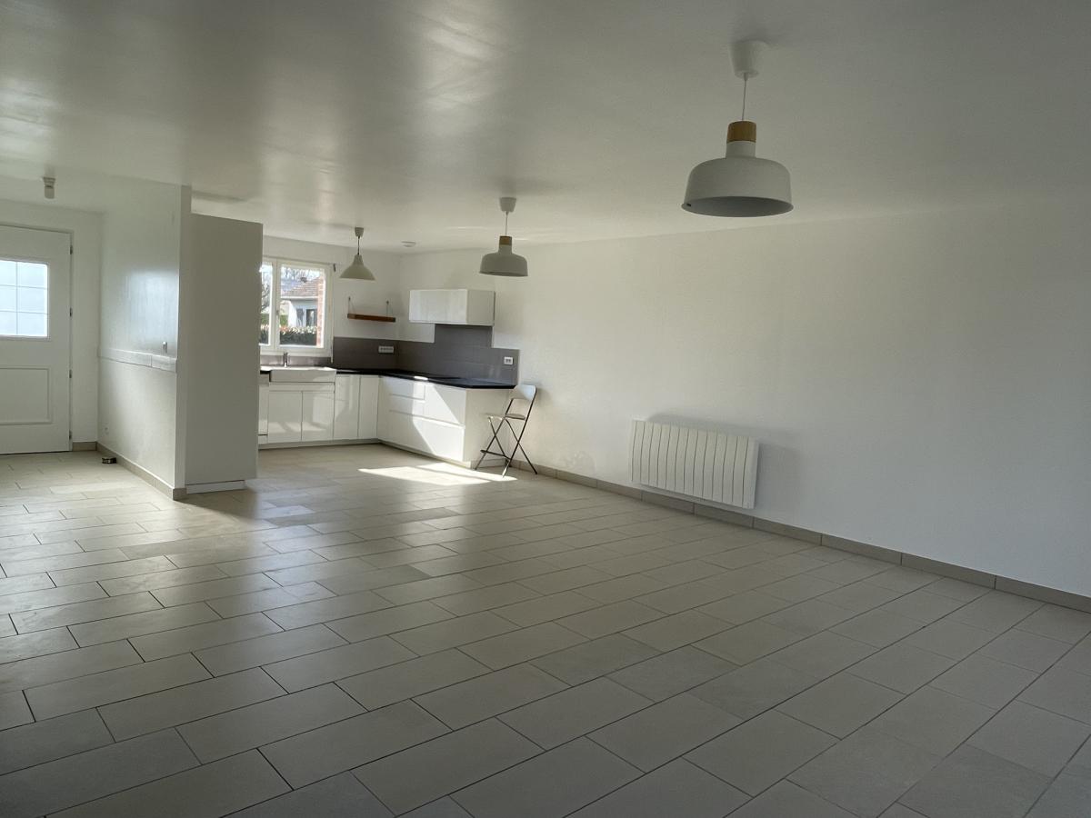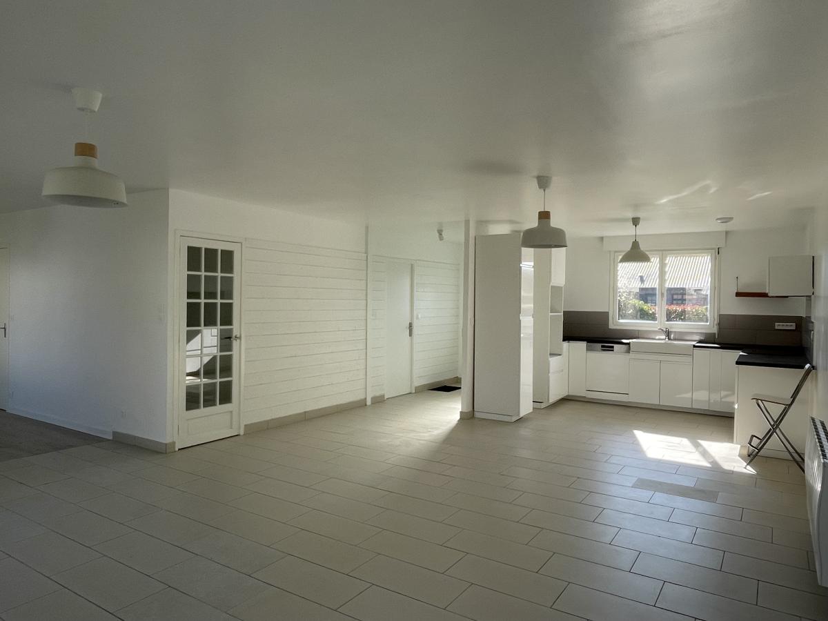 Elle comprend en rdc : une entrée, une vaste pièce de vie d'env. 58m² : cuisine équipée ouverte sur le salon/SAM, un WC, une salle de douche (récente), 2 chambres, une buanderie et un garage.