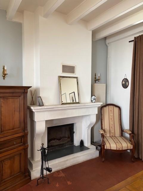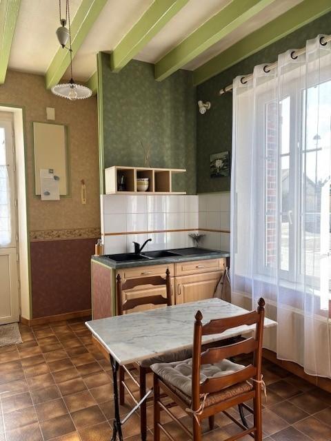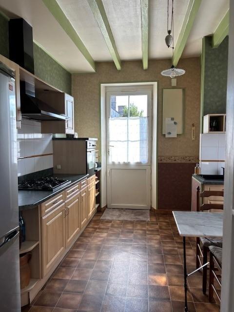 Cuisine aménagée et équipée, salle à manger-salon avec cheminée, salle de bains et wc, bureau (avec escalier accès étage)