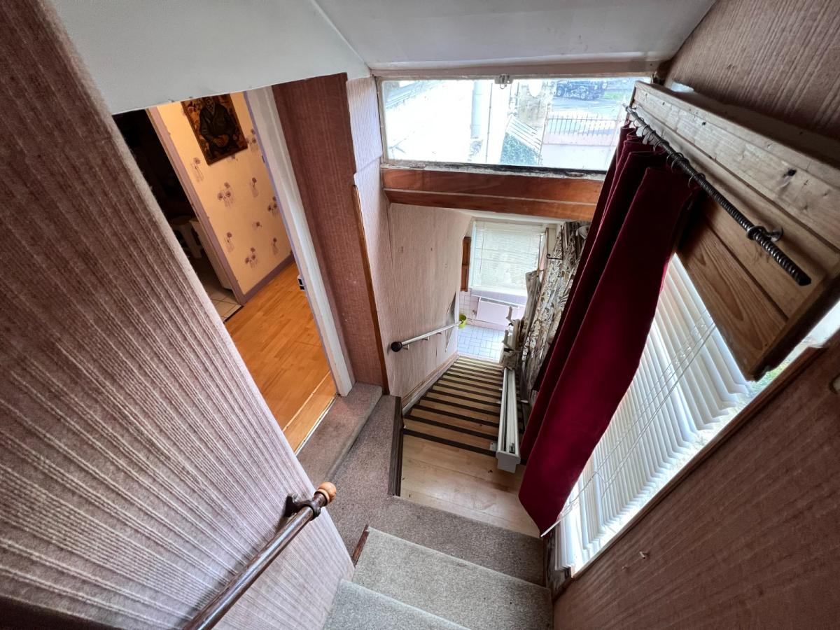 A mi-étage : un palier, une salle de bains, deux chambres en enfilade, un WC.