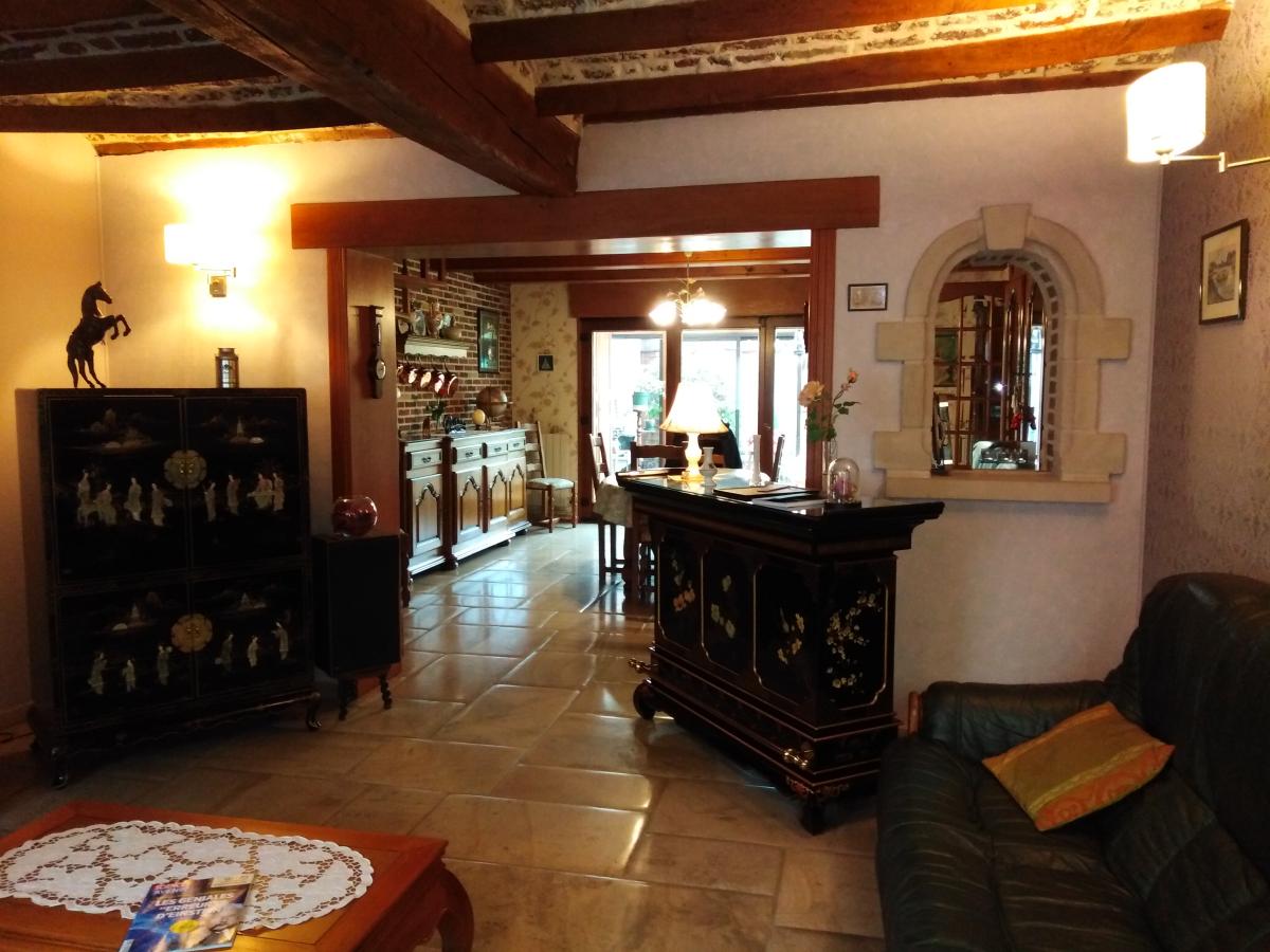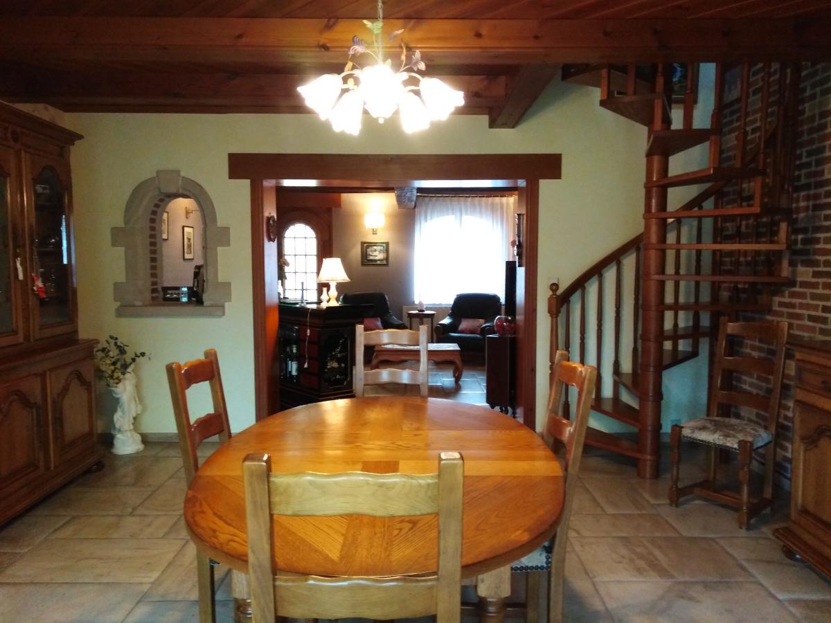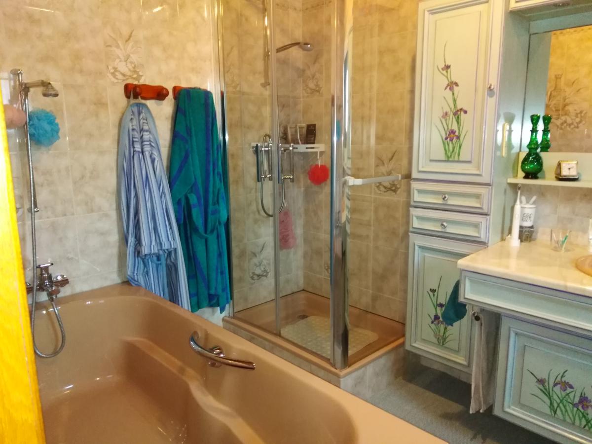 Au rdc : Salon/séjour avec cheminée, cuisine aménagée et équipée, véranda, wc, espace lingerie, 1 chambre avec salle de bains attenante ;