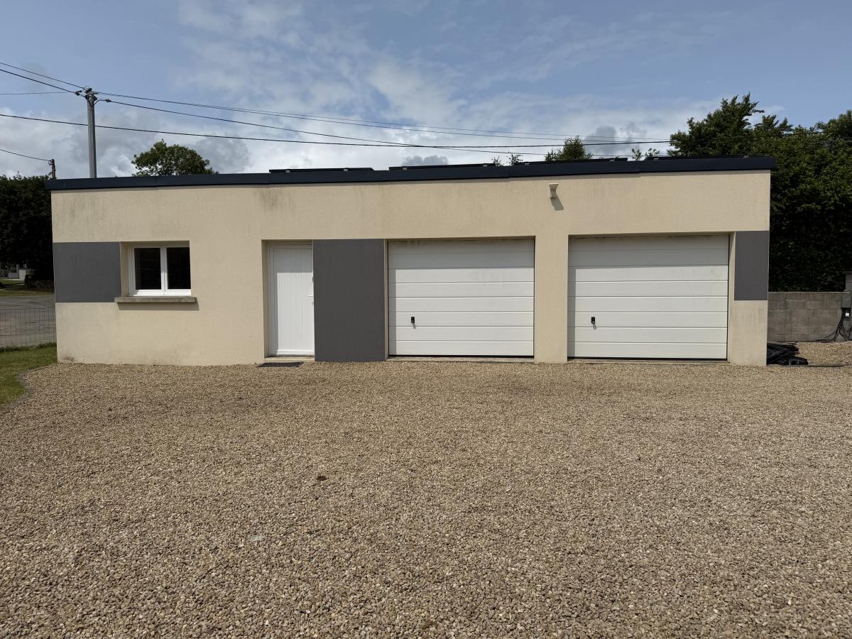 Dépendance en parpaings sous bac acier à usage de garage double avec portail motorisé et atelier.