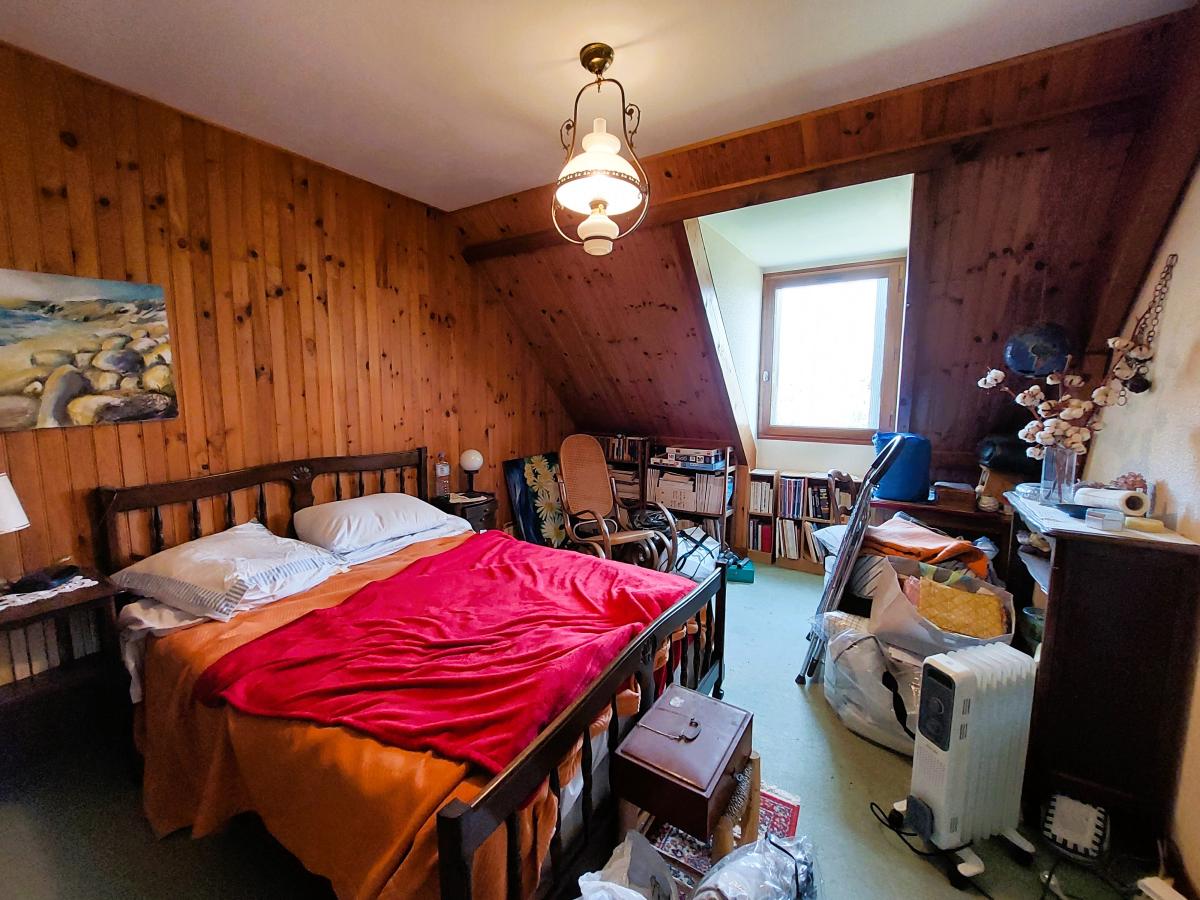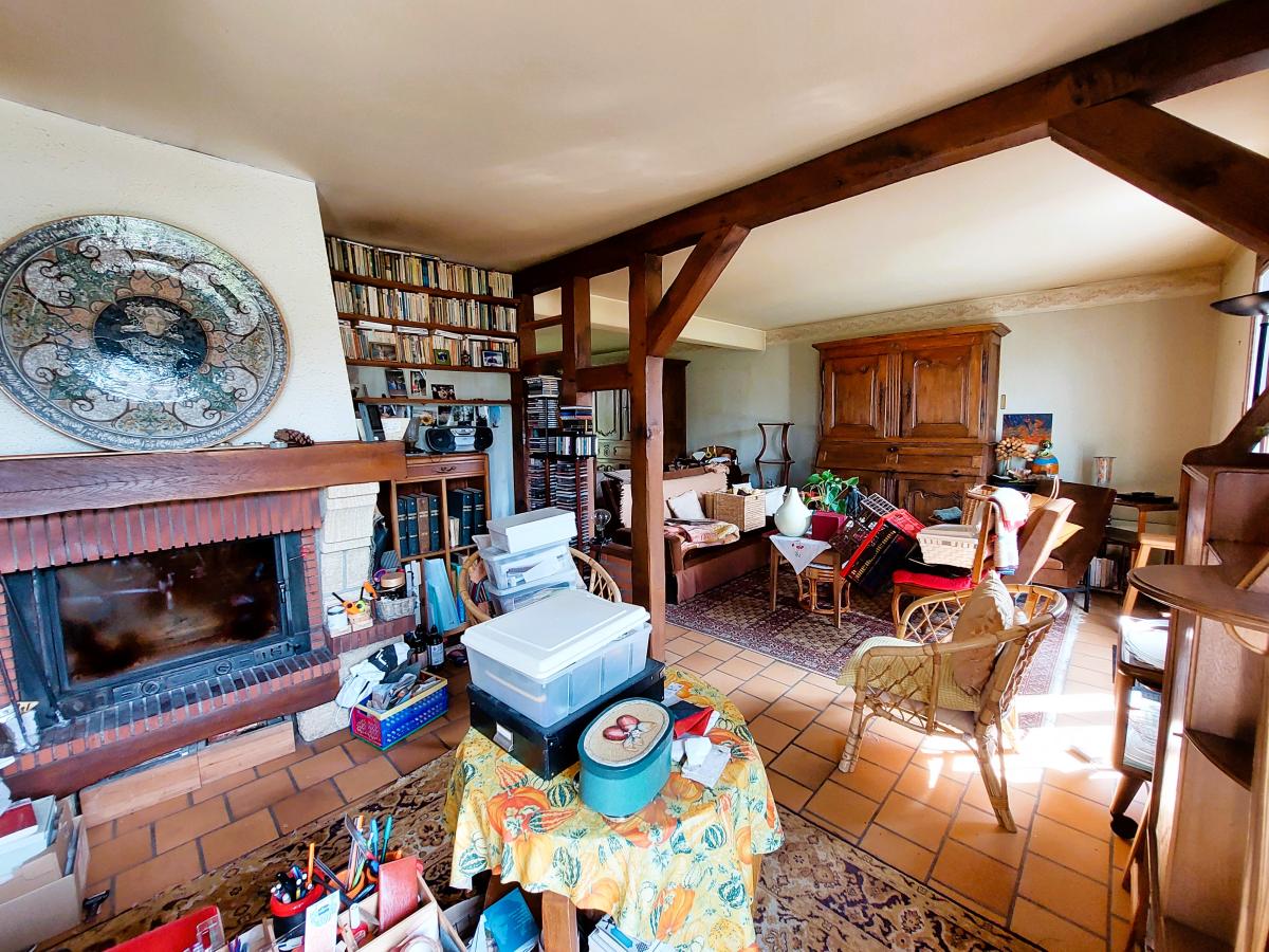 Au rez de chaussée : entrée, séjour - salon avec cheminée, cuisine équipée, chambre, wc.