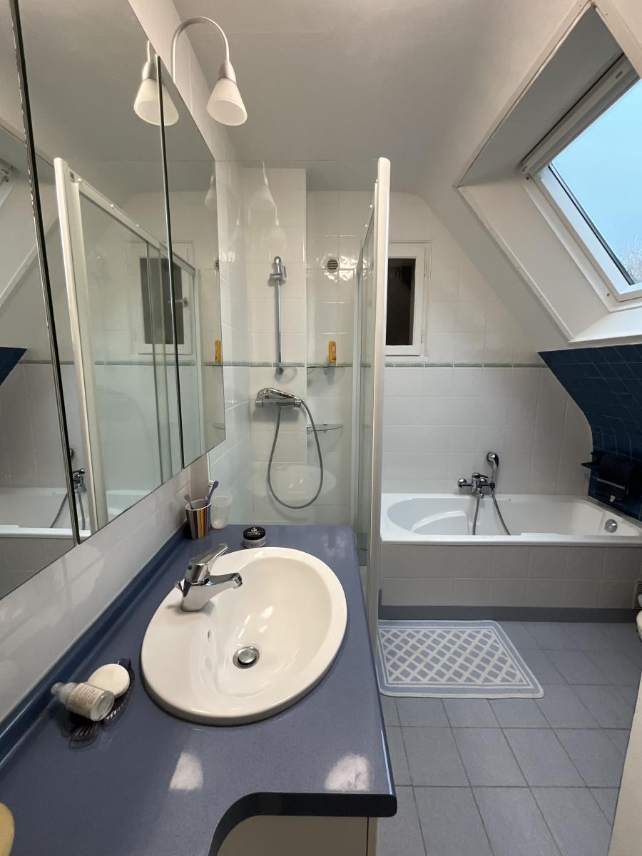 - A l'étage : palier, salle de bains avec douche et wc, 3 chambres dont une avec bureau en enfilade, débarras