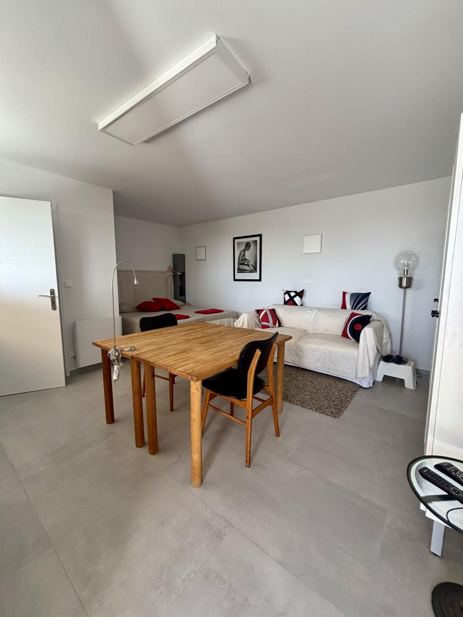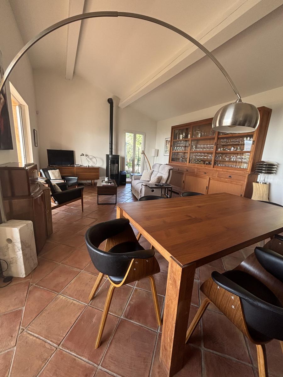 Au rez-de-chaussée, une entrée donne accès à une cuisine indépendante équipée et à un vaste séjour de 33 m² baigné de lumière grâce à ses grandes baies vitrées à galandage, tous deux ouverts sur une grande terrasse exposée plein Sud.
