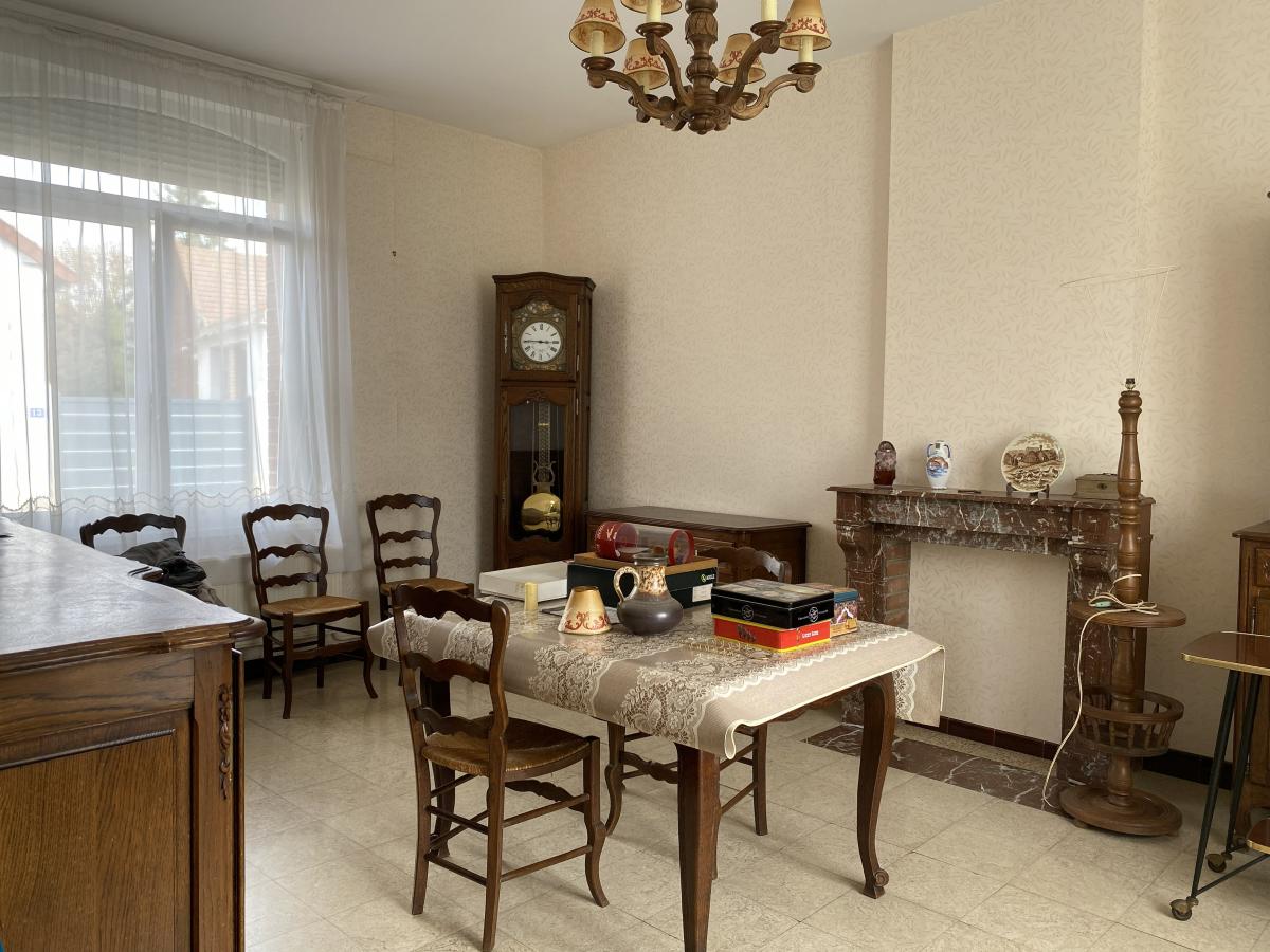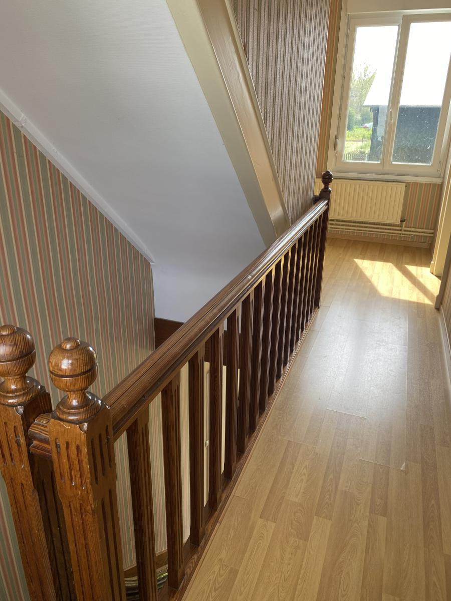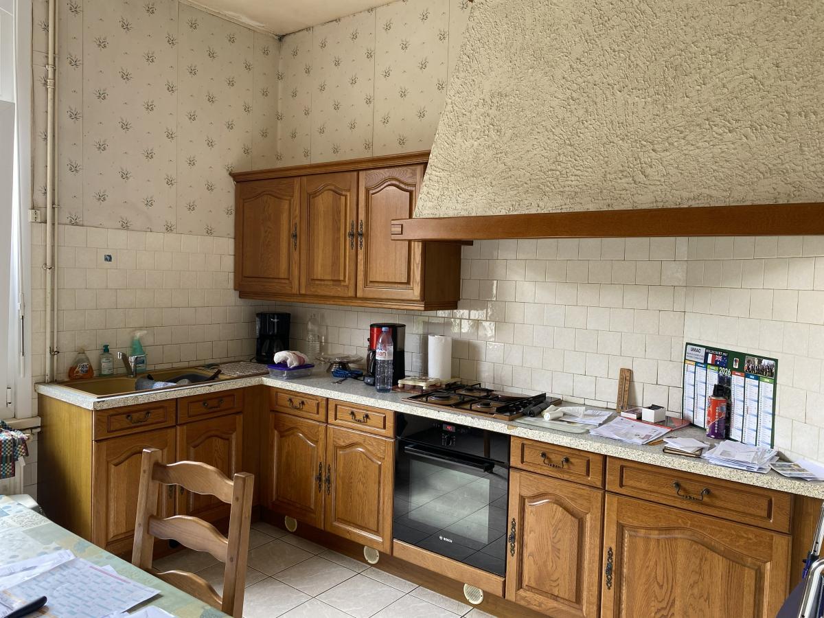 Partie habitation : s/cave - Au RDC : couloir d'entrée, cuisine, salon, séjour - Etage : palier, 3 chambres, salle de bains et WC + grenier au-dessus - Double-vitrage - C/C gaz (chaudière récente).