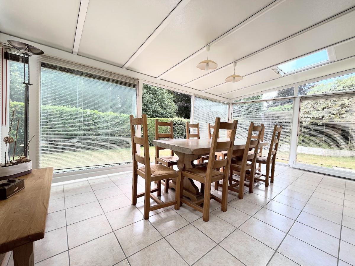 Une véranda plein sud avec vue dégagée sur la nature, parfaite pour les repas et les moments de détente,