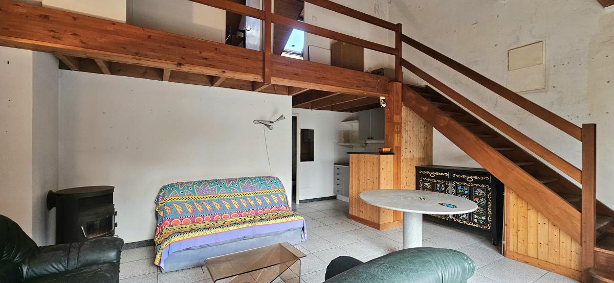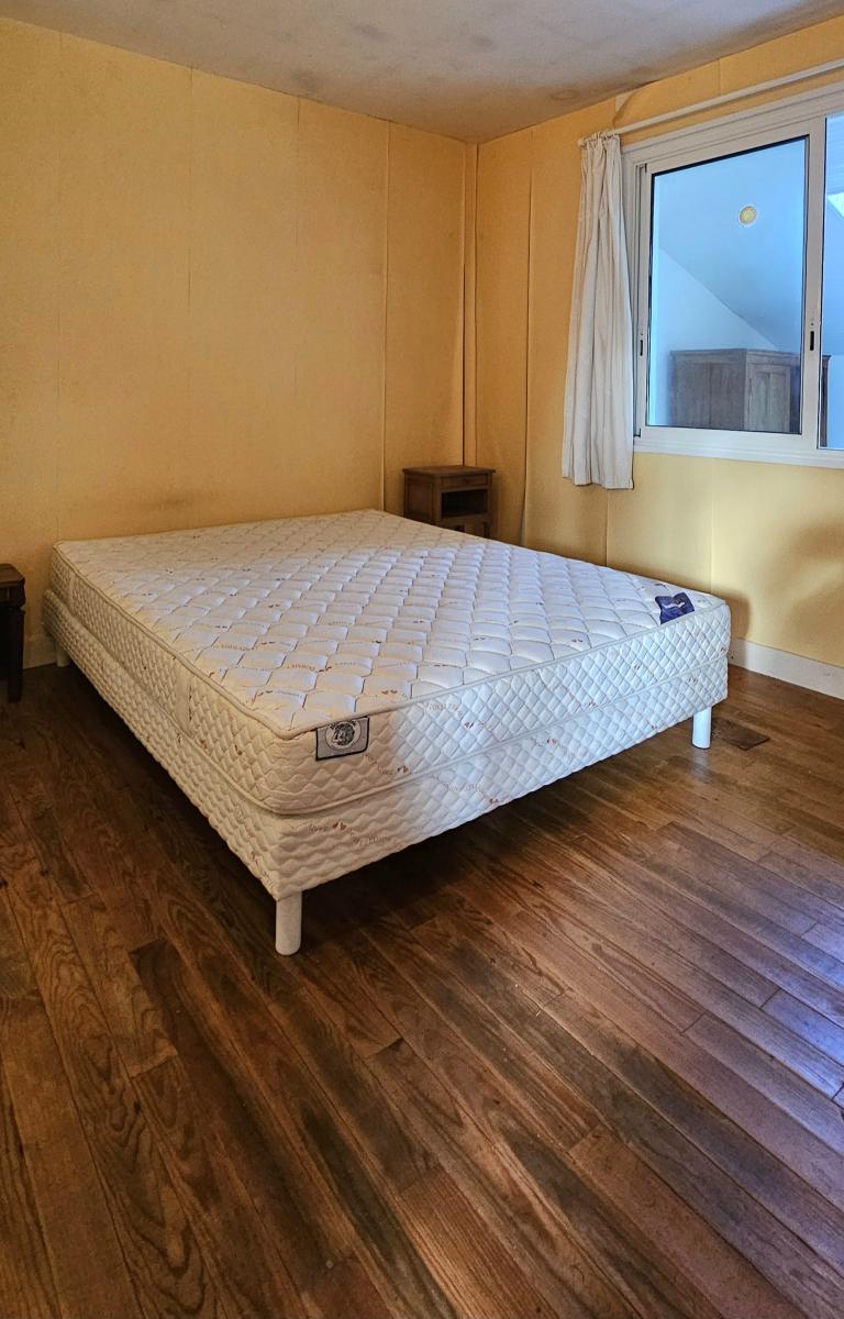 Construction de 1998/1990, en toit double pente orienté Ouest, comprenant : pièce de vie avec poêle à bois, coin cuisine ouverte et grande baie vitrée donnant sur une terrasse à l'Ouest, une salle de bain avec simple vasque et WC. A l'étage, couloir en mezzanine desservant deux pièces à usage de chambre (3m2 habitable et 8.18m2 au sol).