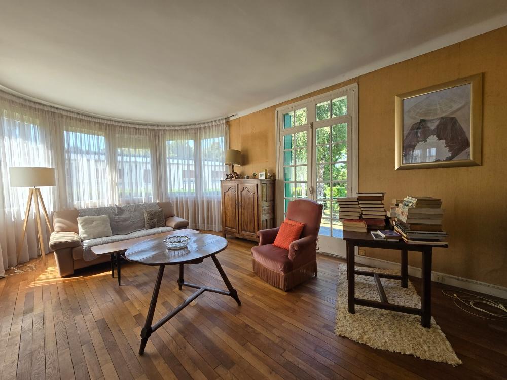 au rez de chaussée: hall d'entrée, salle de douche, cuisine (12m2), salle et salon (43m2 parquet, belle hauteur sous plafond et bow-window ), WC