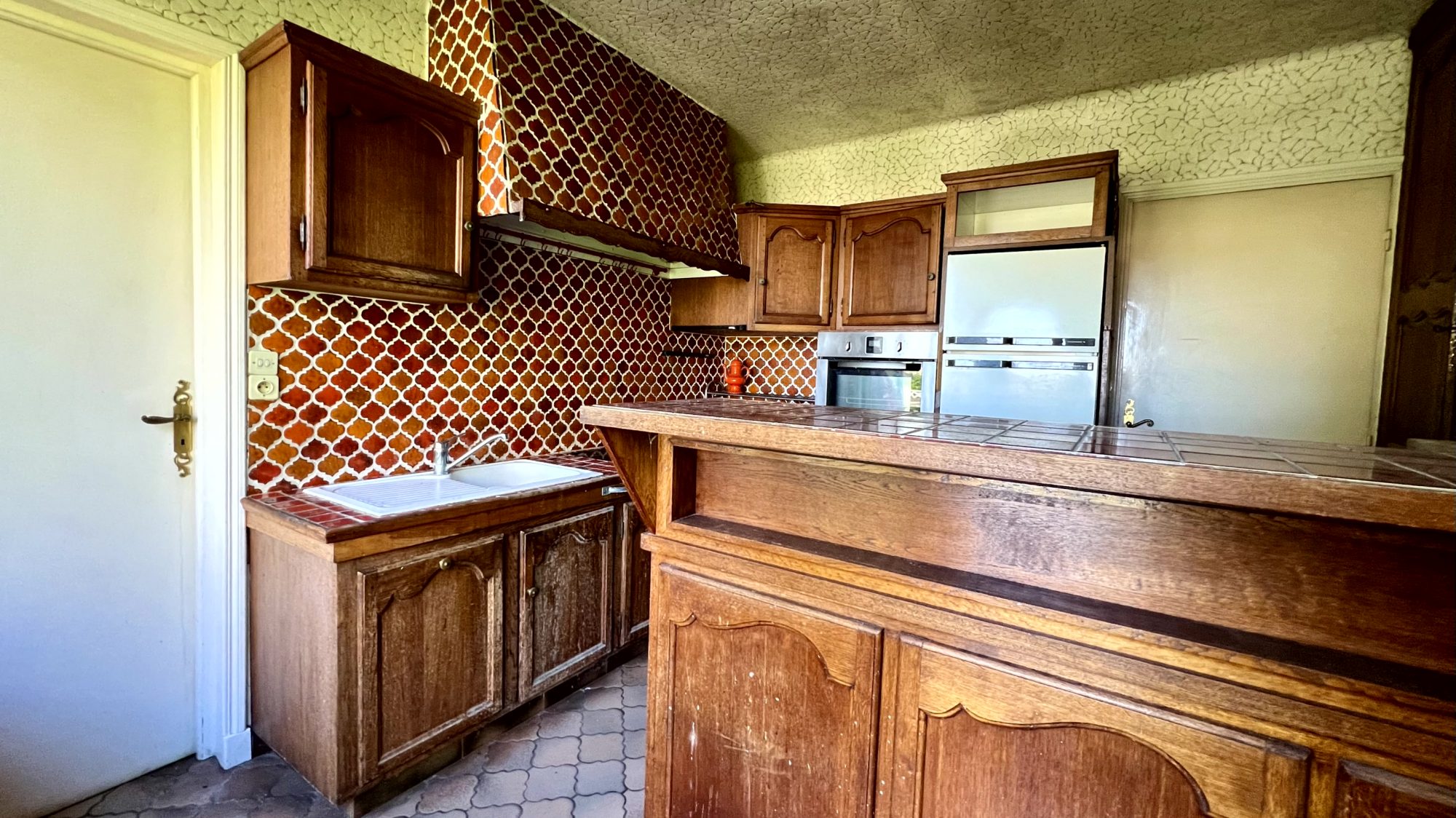 La cuisine à l'écart se veut fonctionnelle et donne sur l'extérieur.