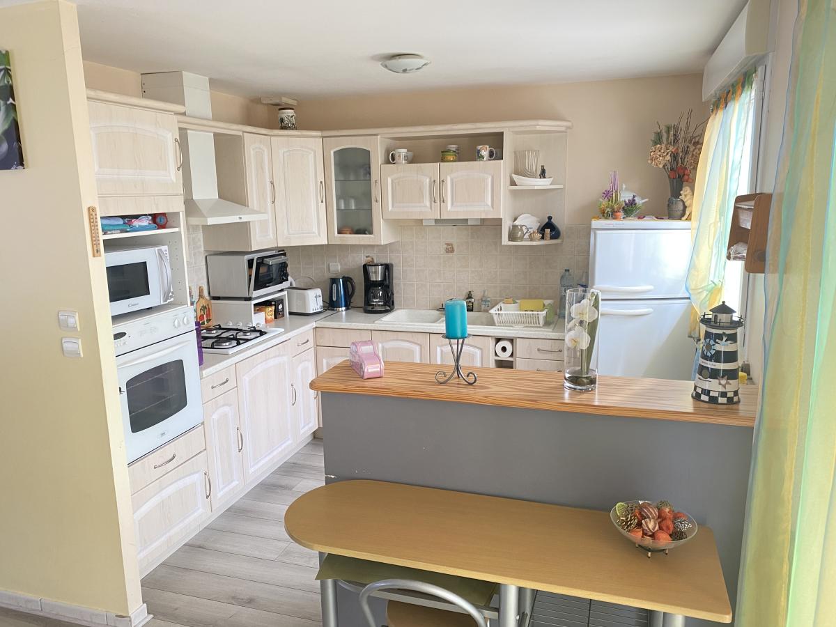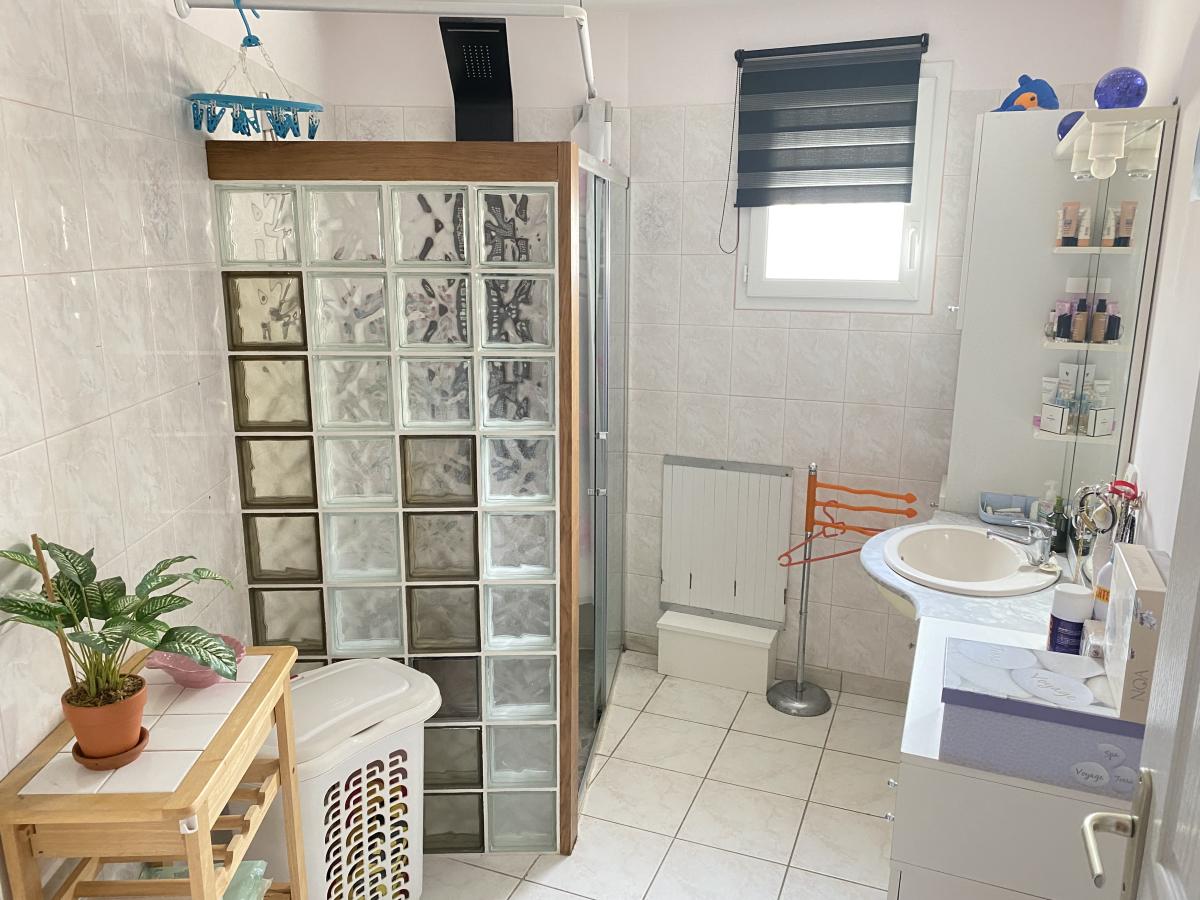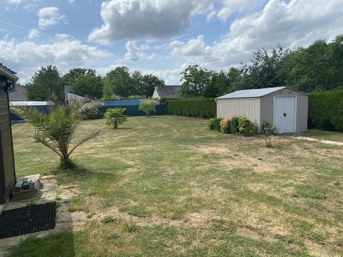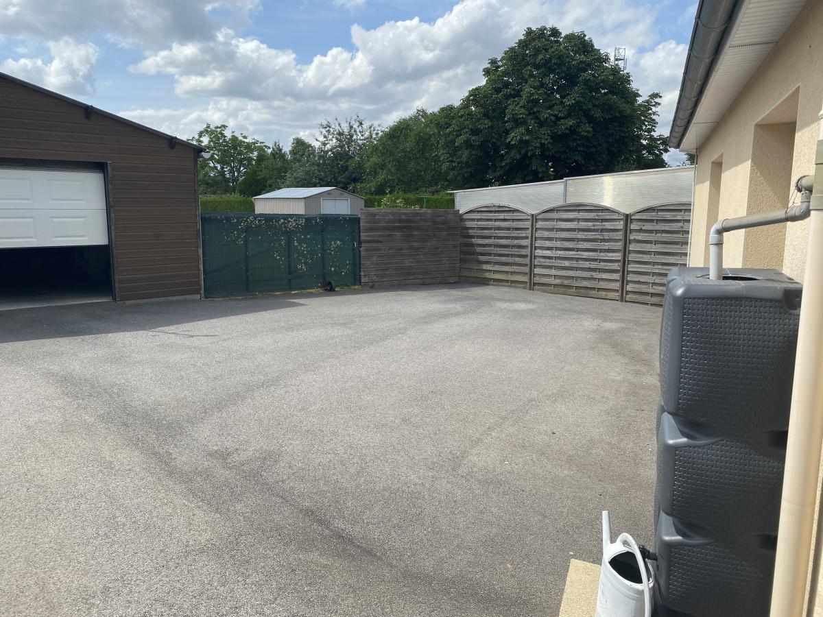 GUENROUET / A 500 m du centre bourg et des écoles. Belle maison contemporaine de 2004, édifiée de plain-pied et parfaitement entretenue d'environ 141 m² pour 101 m² habitables, et comprenant une entrée donnant sur un salon / séjour de plus de 35 m² donnant sur une terrasse avec pergola, une cuisine américaine aménagée et équipée, une arrière cuisine, un dégagement desservant trois chambres, un bureau, une salle d'eau et un wc. Cour goudronnée permettant le stationnement de plusieurs véhicules et l'accès à un grand garage indépendant. Le tout sur une parcelle paysagée et entièrement constructible de 1 169 m².