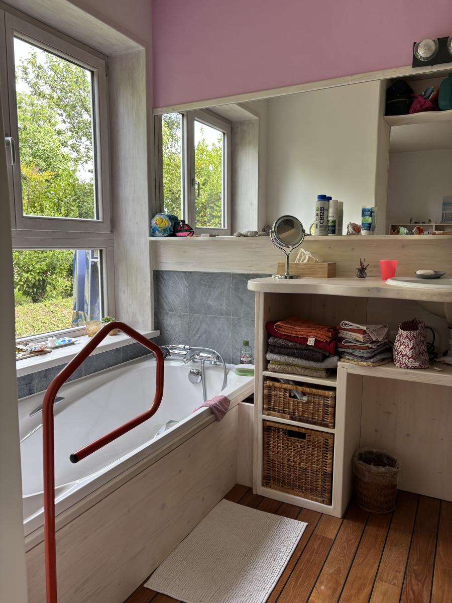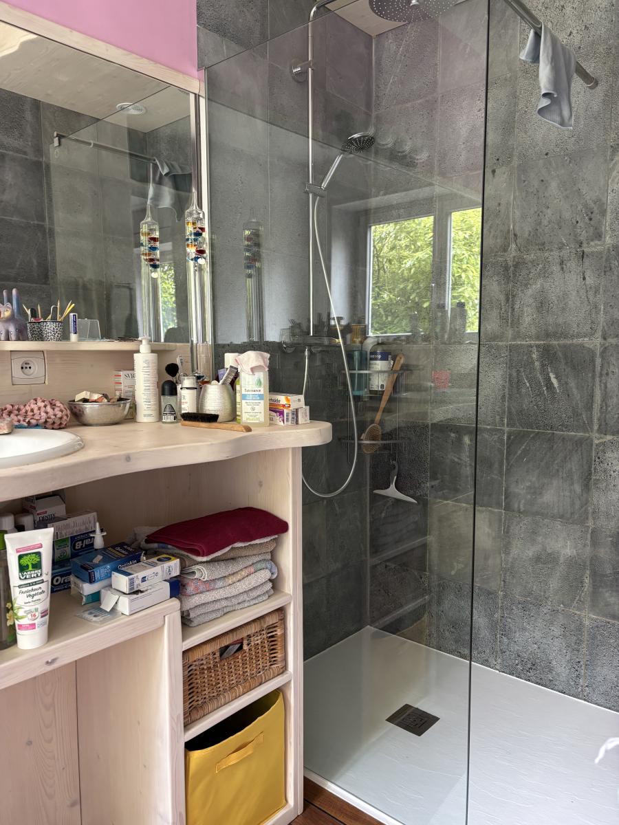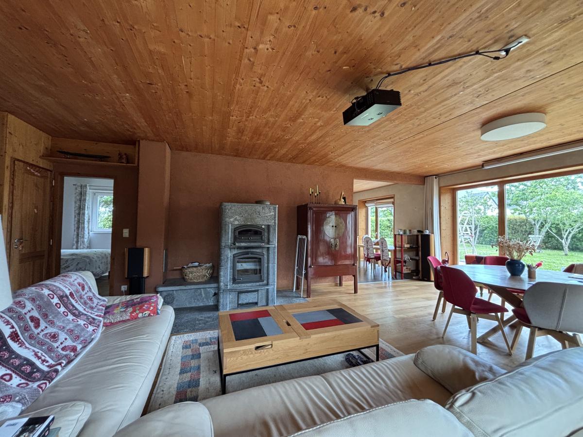 - Au rez-de-chaussée : entrée, grand séjour-salon (50 m²) avec poêle de masse, véranda (16 m²), cuisine ouverte, arrière cuisine, une chambre avec dressing et salle de bains avec douche, wc avec lave mains, buanderie.