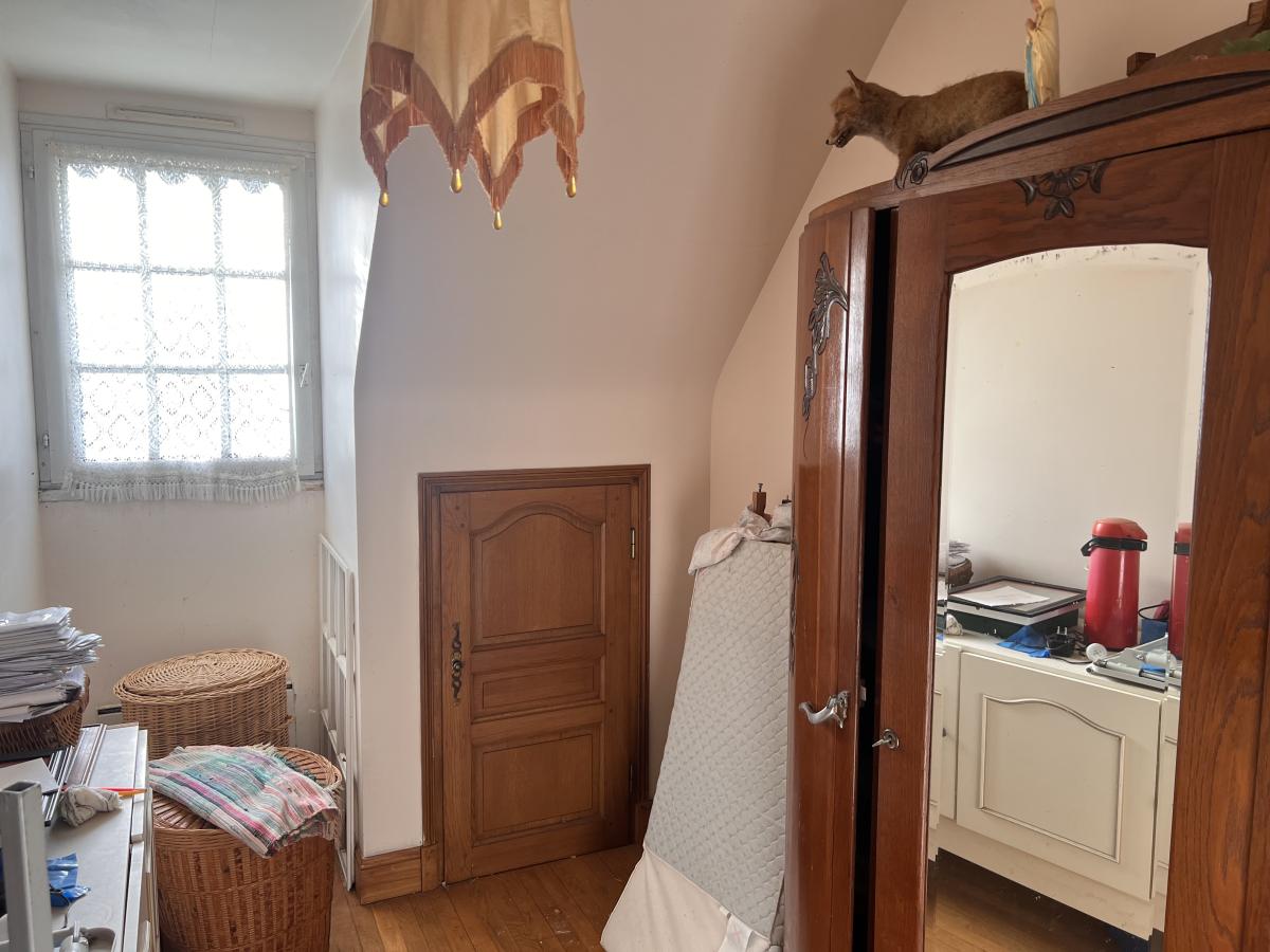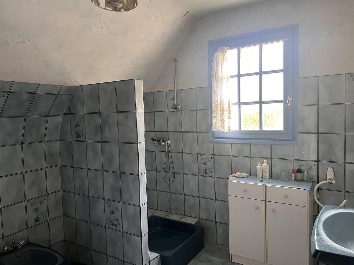 - À l’étage : palier desservant bureau, trois chambres dont deux avec placards, salle de bains et douches, WC.