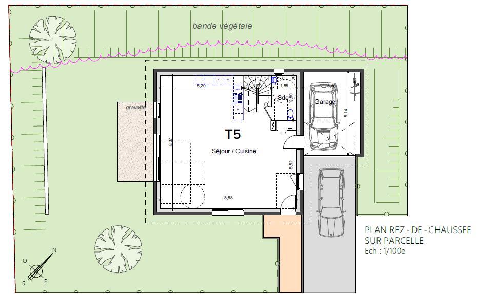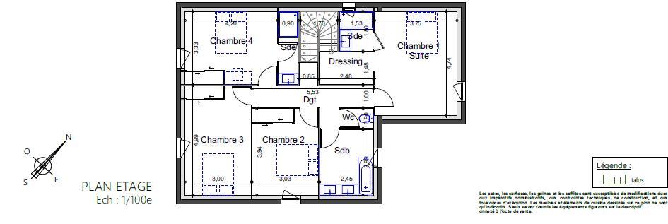 - Au rez-de-chaussée : entrée sur séjour-salon-espace cuisine (65 m2), départ d'escalier pour l'étage, salle de douche avec W.C. placard.
