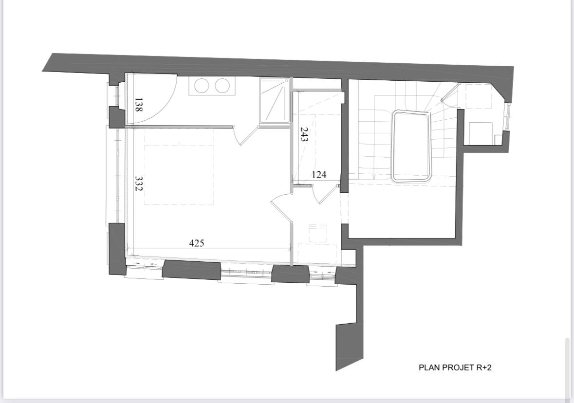 • 3ème niveau : pièce de vie avec grandes baies vitrées type atelier sur deux pans de murs, et coin cuisine aménagé ;