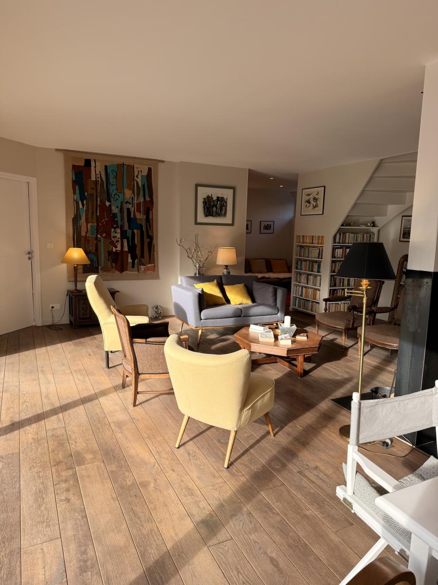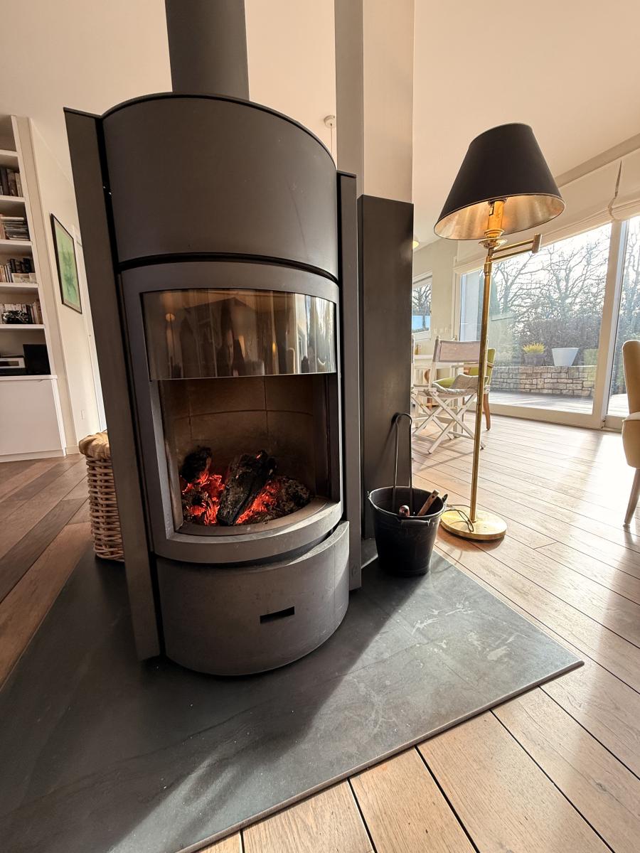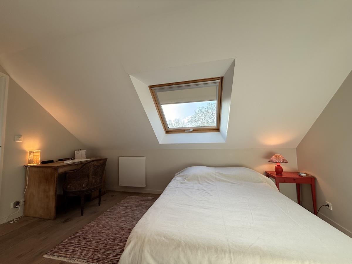 Le rez-de-chaussée propose un grand salon séjour lumineux avec un poêle à bois et un coin télé, une cuisine, une chambre parentale avec dressing, une salle d’eau avec WC et un WC indépendant.