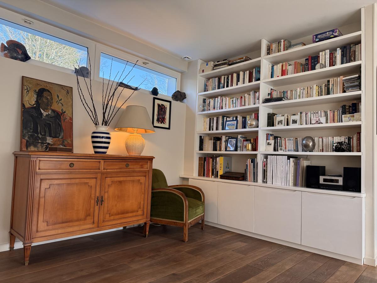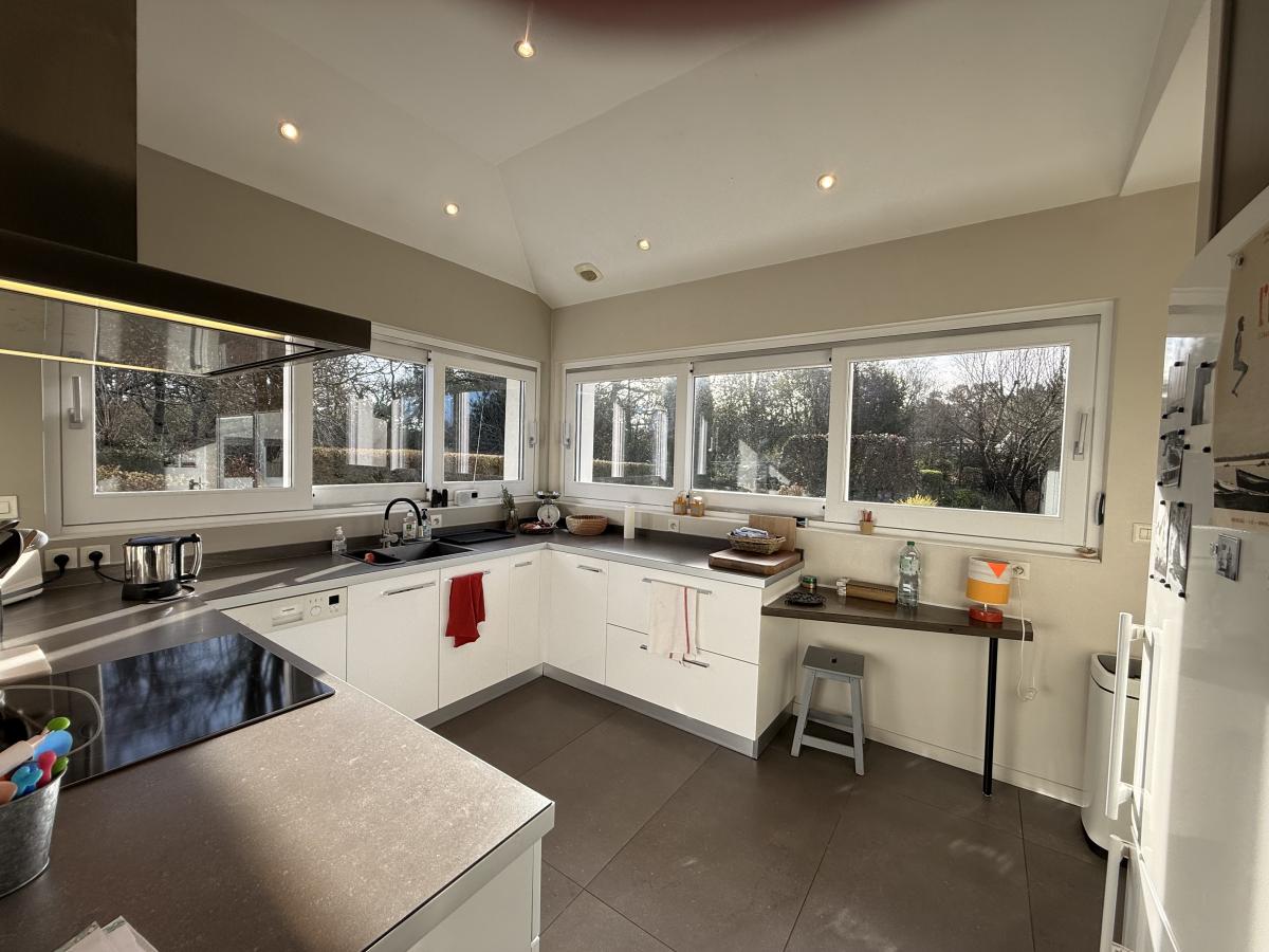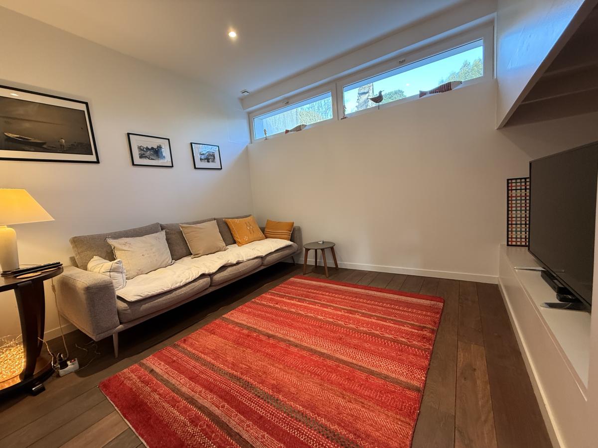 Le rez-de-chaussée propose un grand salon séjour lumineux avec un poêle à bois et un coin télé, une cuisine, une chambre parentale avec dressing, une salle d’eau avec WC et un WC indépendant.