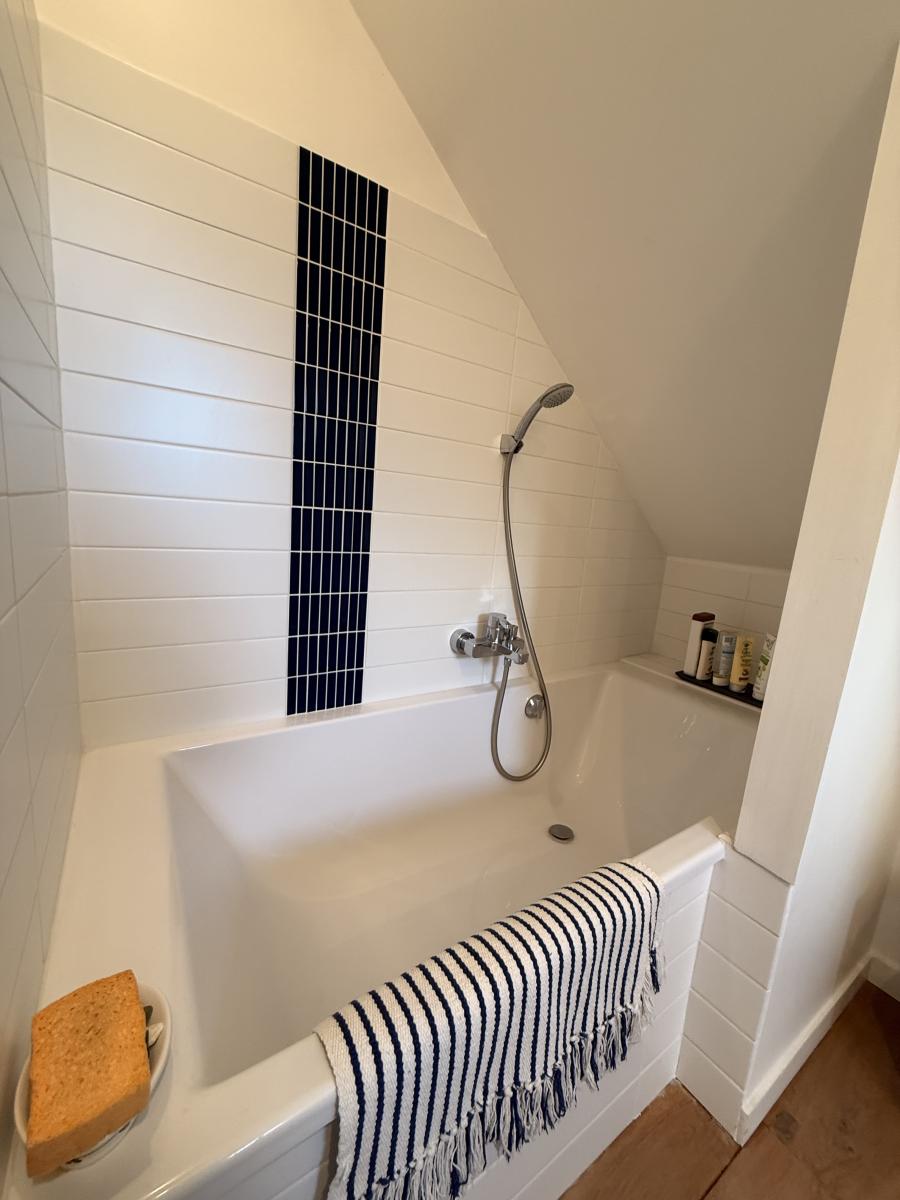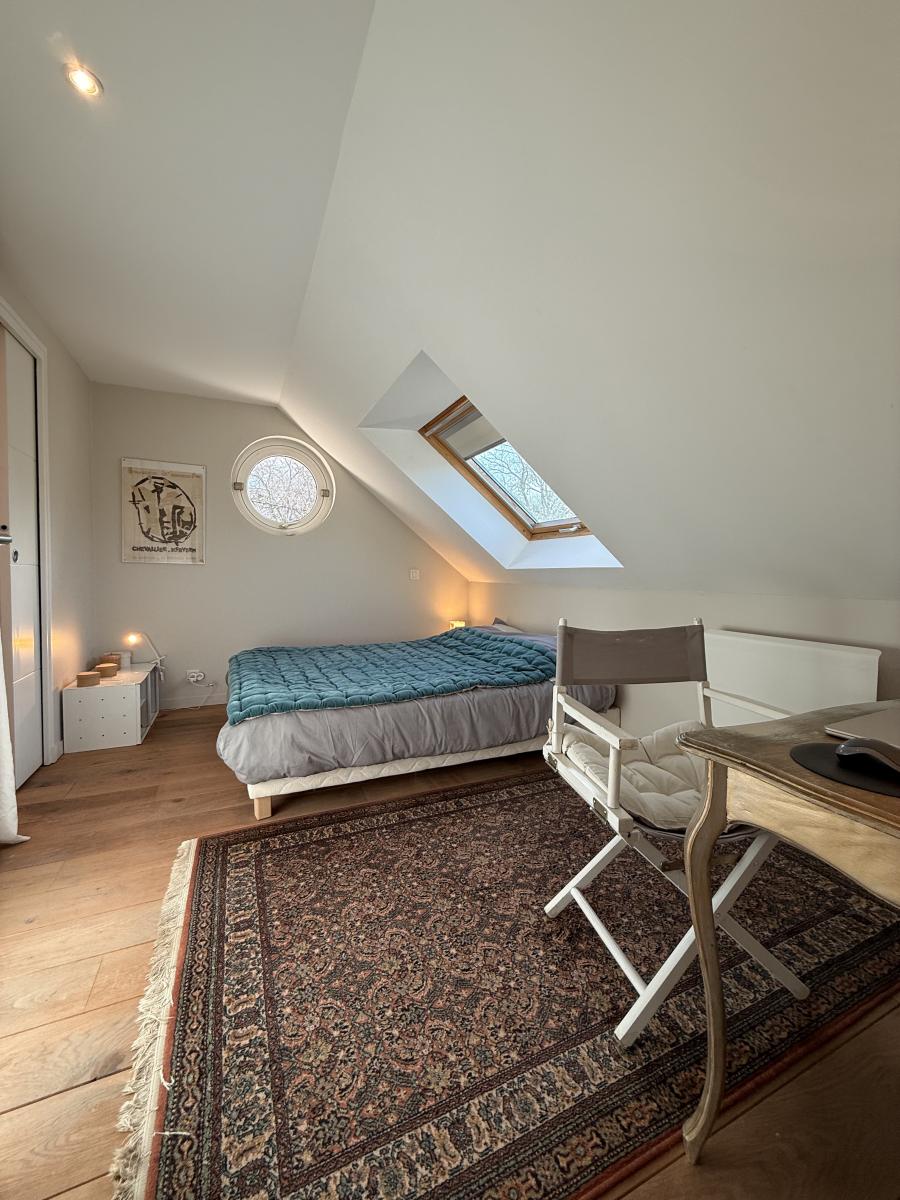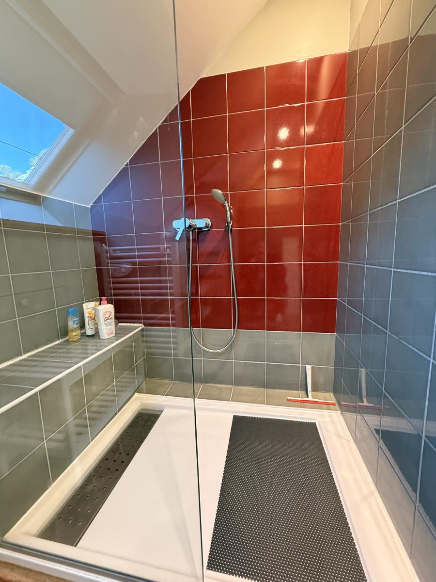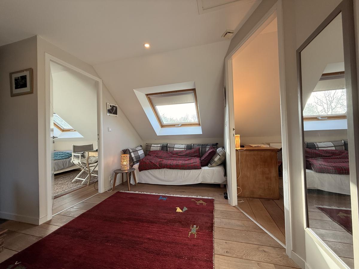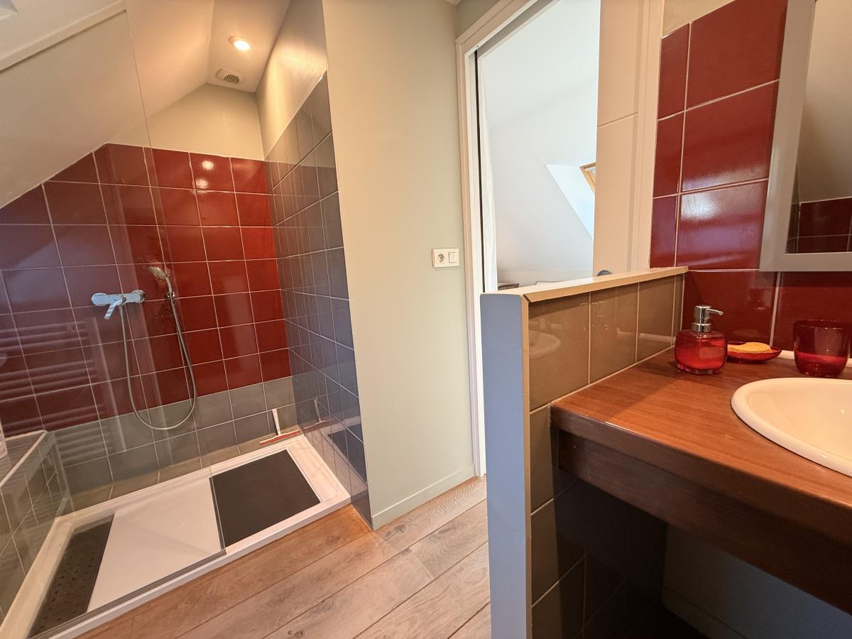 À l’étage, un palier dessert deux chambres, chacune disposant de sa salle d’eau ou salle de bains avec WC.