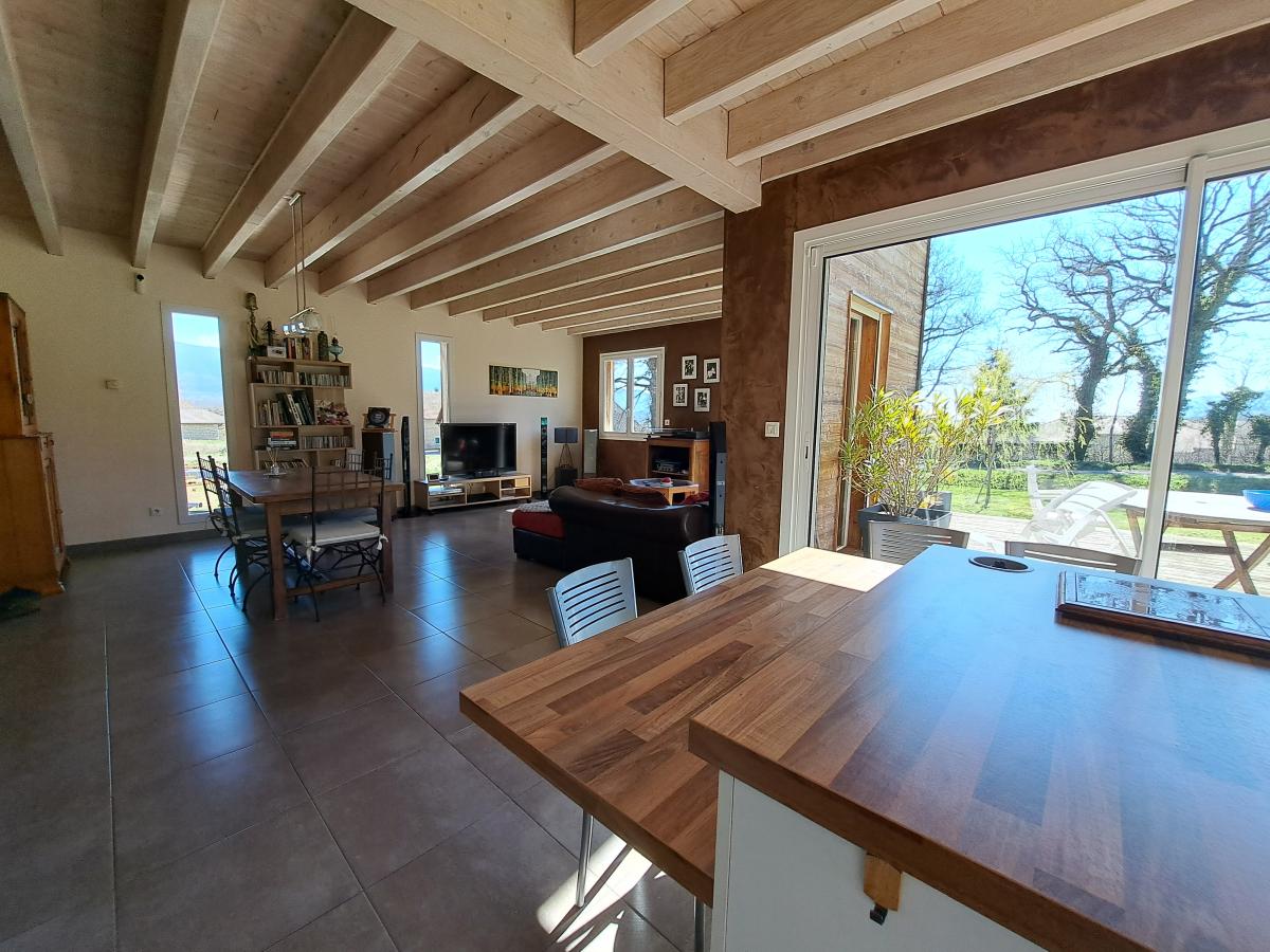 Édifiée sur un terrain de 1 254 m², parfaitement exposé au sud ouest et bénéficiant d’une vue dégagée sur les montagnes, la maison développe 153,6 m² habitables et se compose d’un vaste séjour cuisine de 53,1 m², véritable pièce de vie baignée de lumière grâce à une large baie ouvrant sur une terrasse de 30 m².