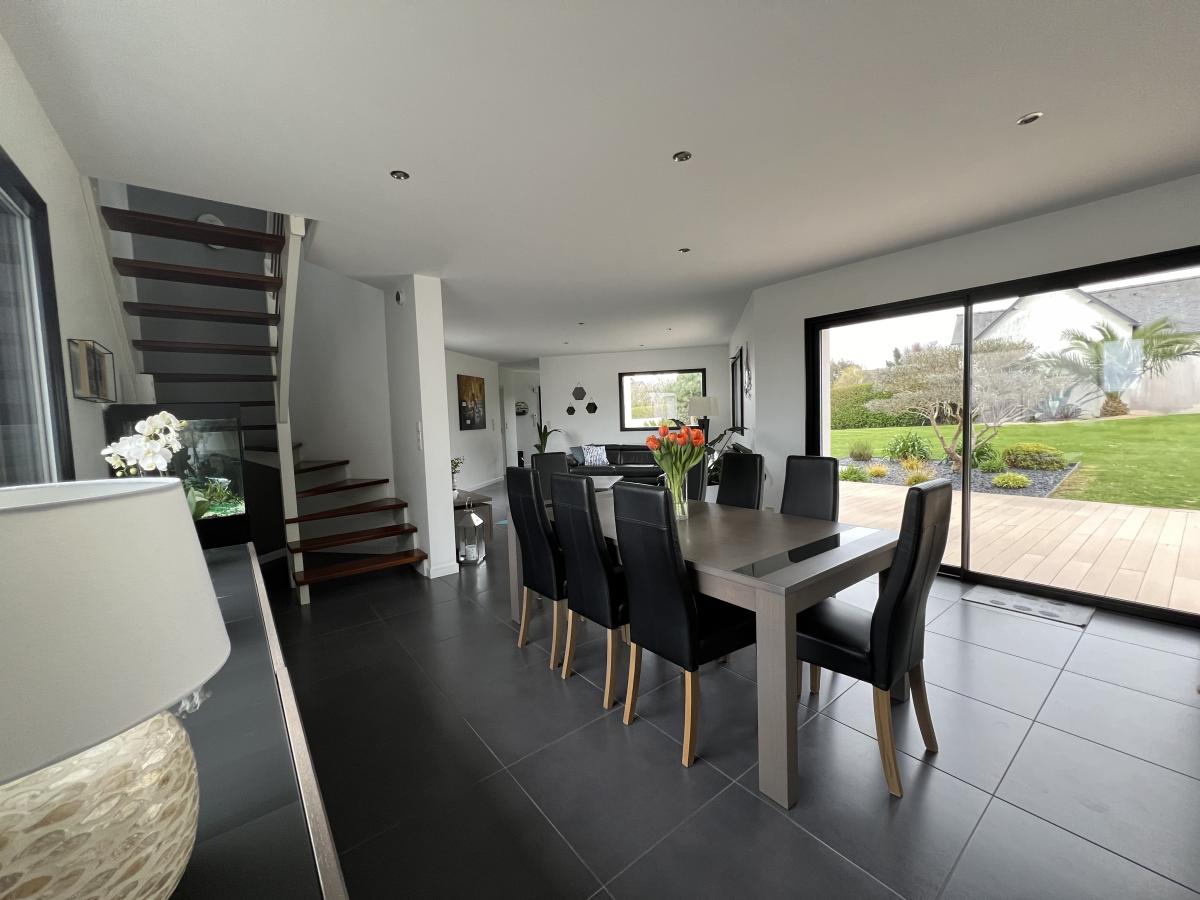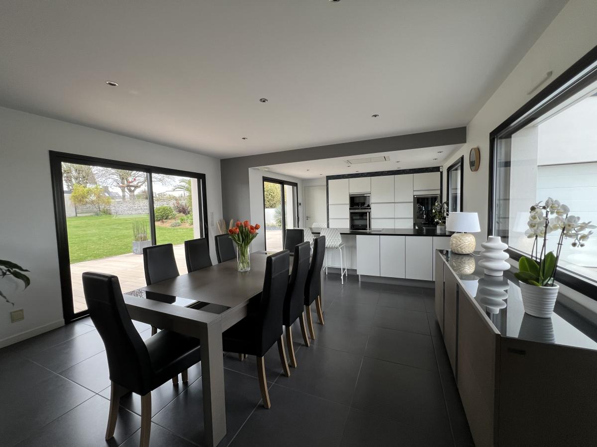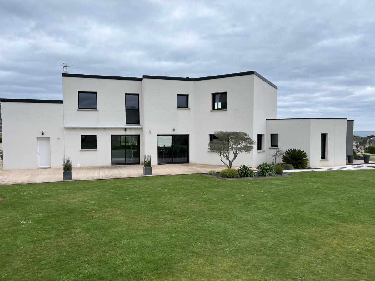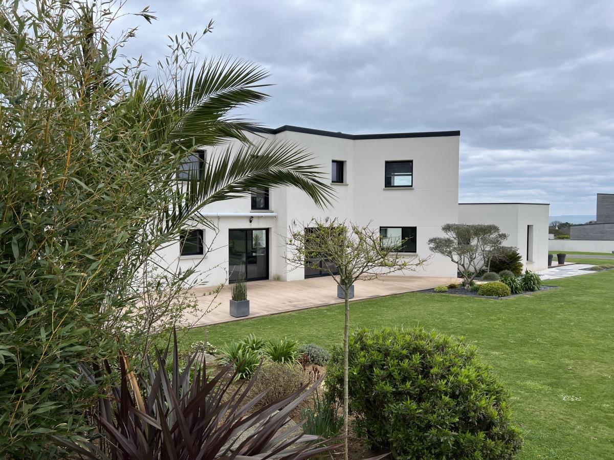 TREVENEUC - côté Mer, Maison contemporaine de 2013 sur terrain de 1823 m², comprenant : Hall d'entrée avec placard, wc avec lave-mains, suite parentale : sas avec placards, salle d'eau, chambre, cuisine aménagée et équipée ouverte sur séjour-salon VUE MER, arrière-cuisine aménagée, chaufferie, garage double. A l'étage : palier, trois chambres dont deux avec VUE MER, salle de bains baignoire et douche, wc. Terrasse, garage double, jardin paysagé, chauffage géothermie, proche mer.