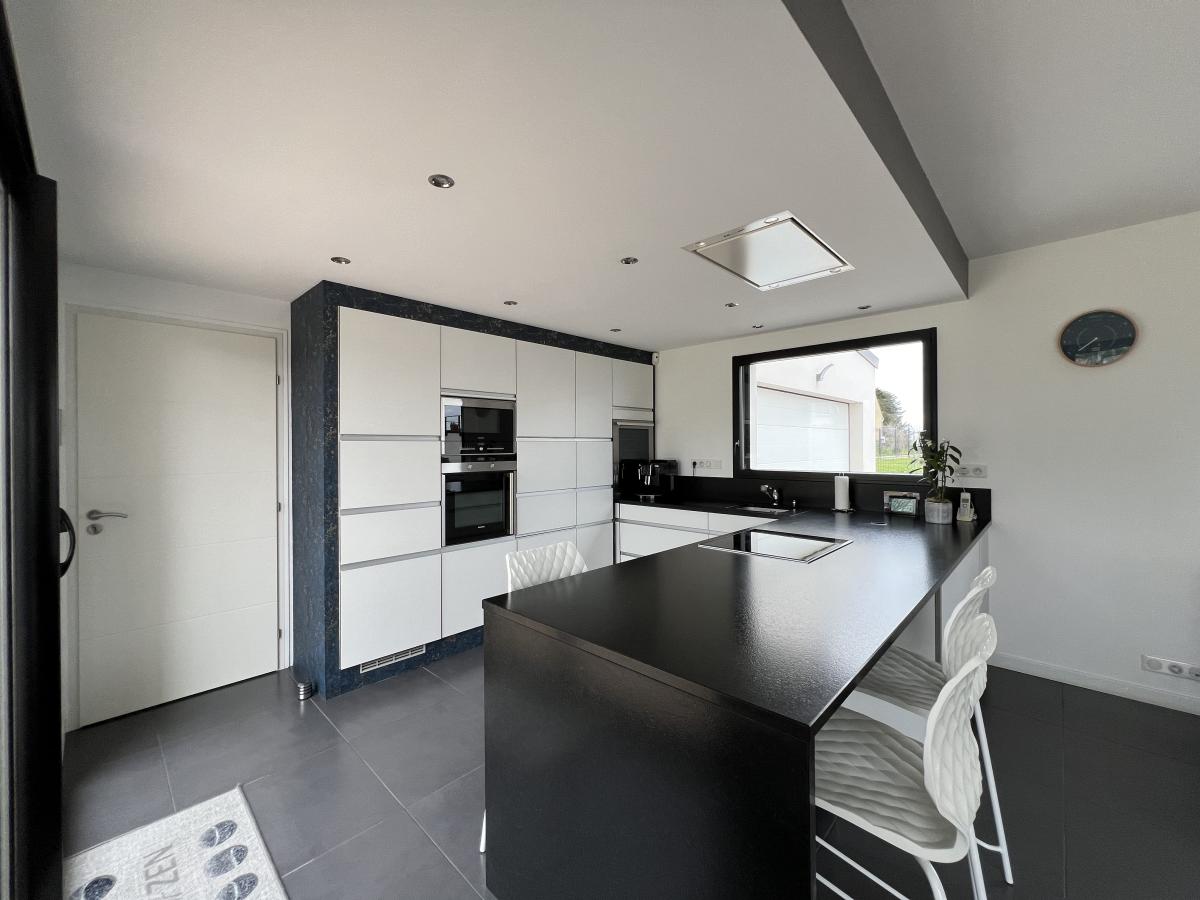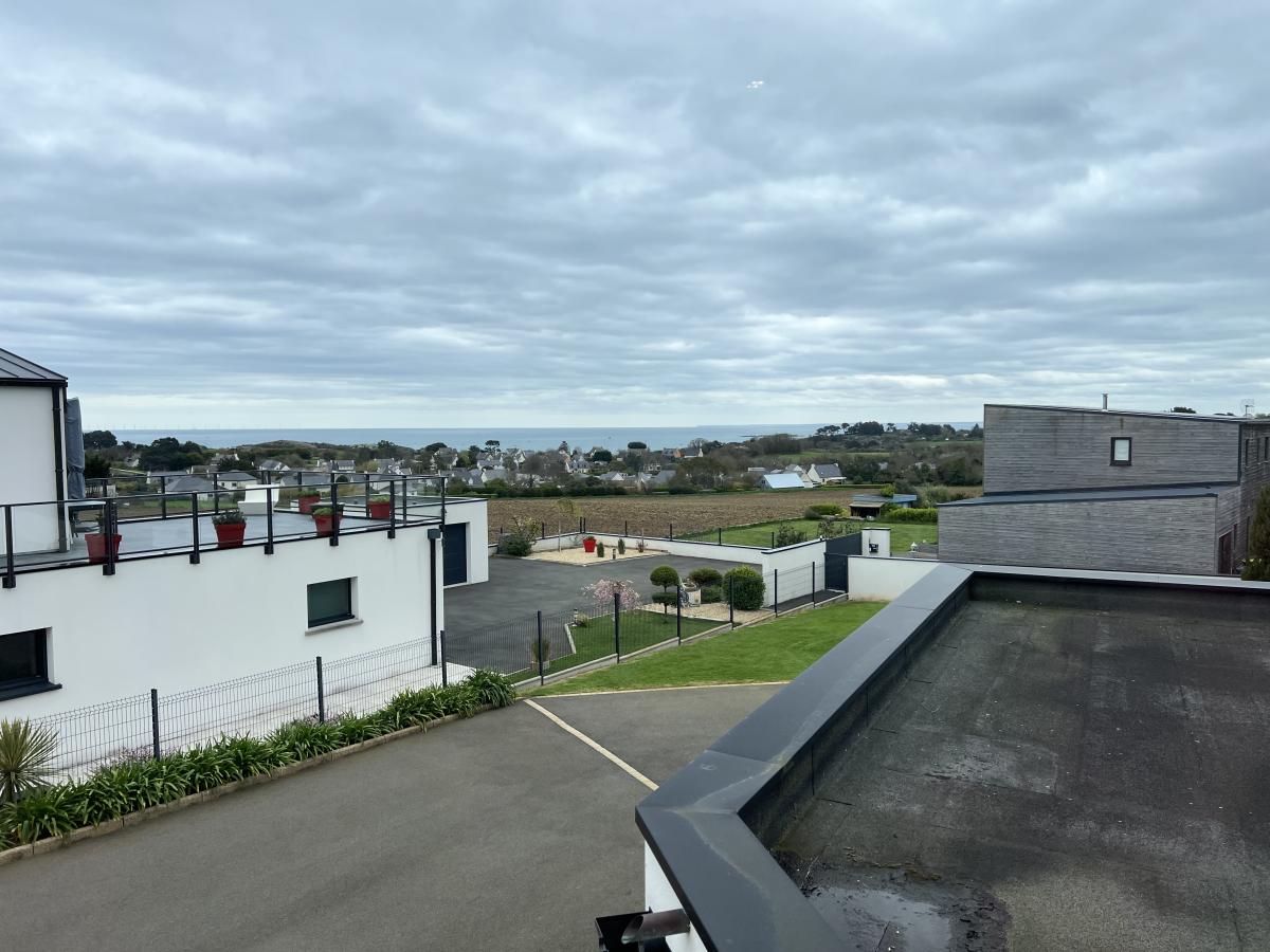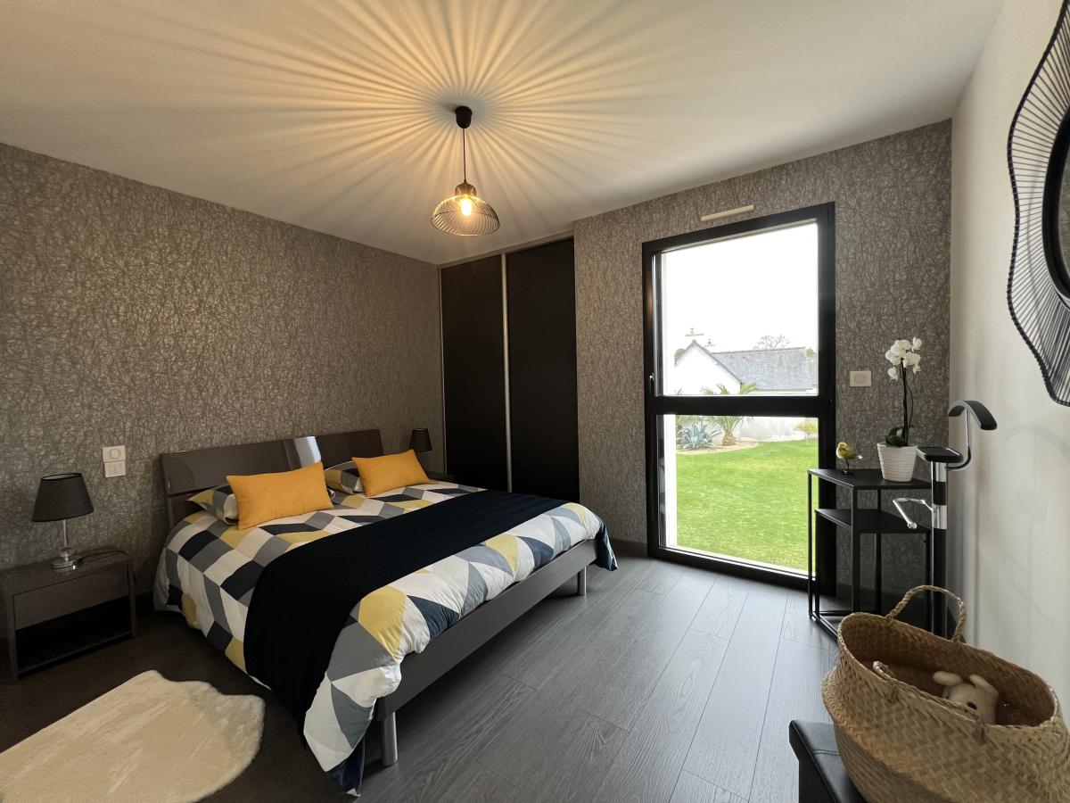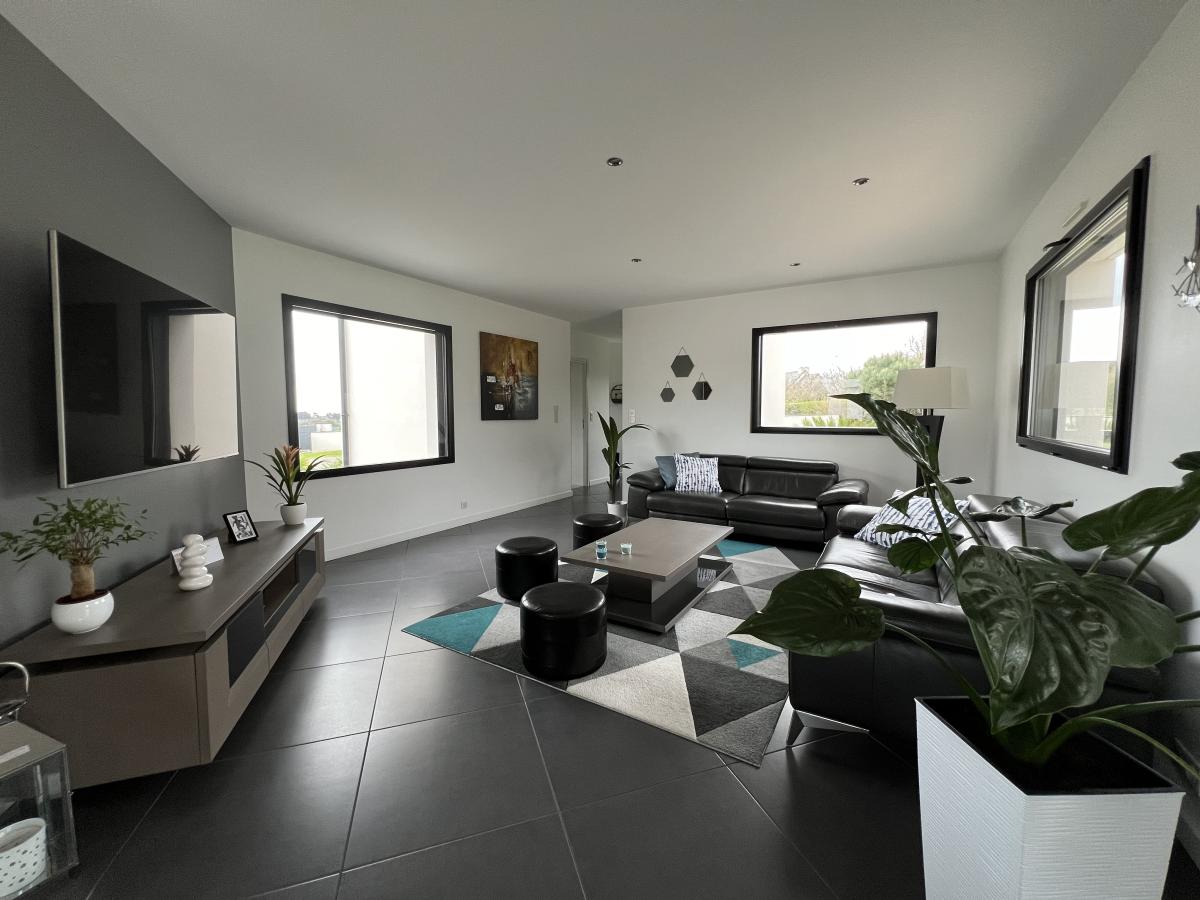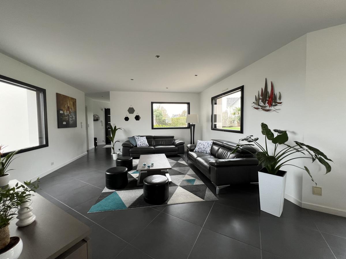 TREVENEUC - côté Mer, Maison contemporaine de 2013 sur terrain de 1823 m², comprenant : Hall d'entrée avec placard, wc avec lave-mains, suite parentale : sas avec placards, salle d'eau, chambre, cuisine aménagée et équipée ouverte sur séjour-salon VUE MER, arrière-cuisine aménagée, chaufferie, garage double. A l'étage : palier, trois chambres dont deux avec VUE MER, salle de bains baignoire et douche, wc. Terrasse, garage double, jardin paysagé, chauffage géothermie, proche mer.