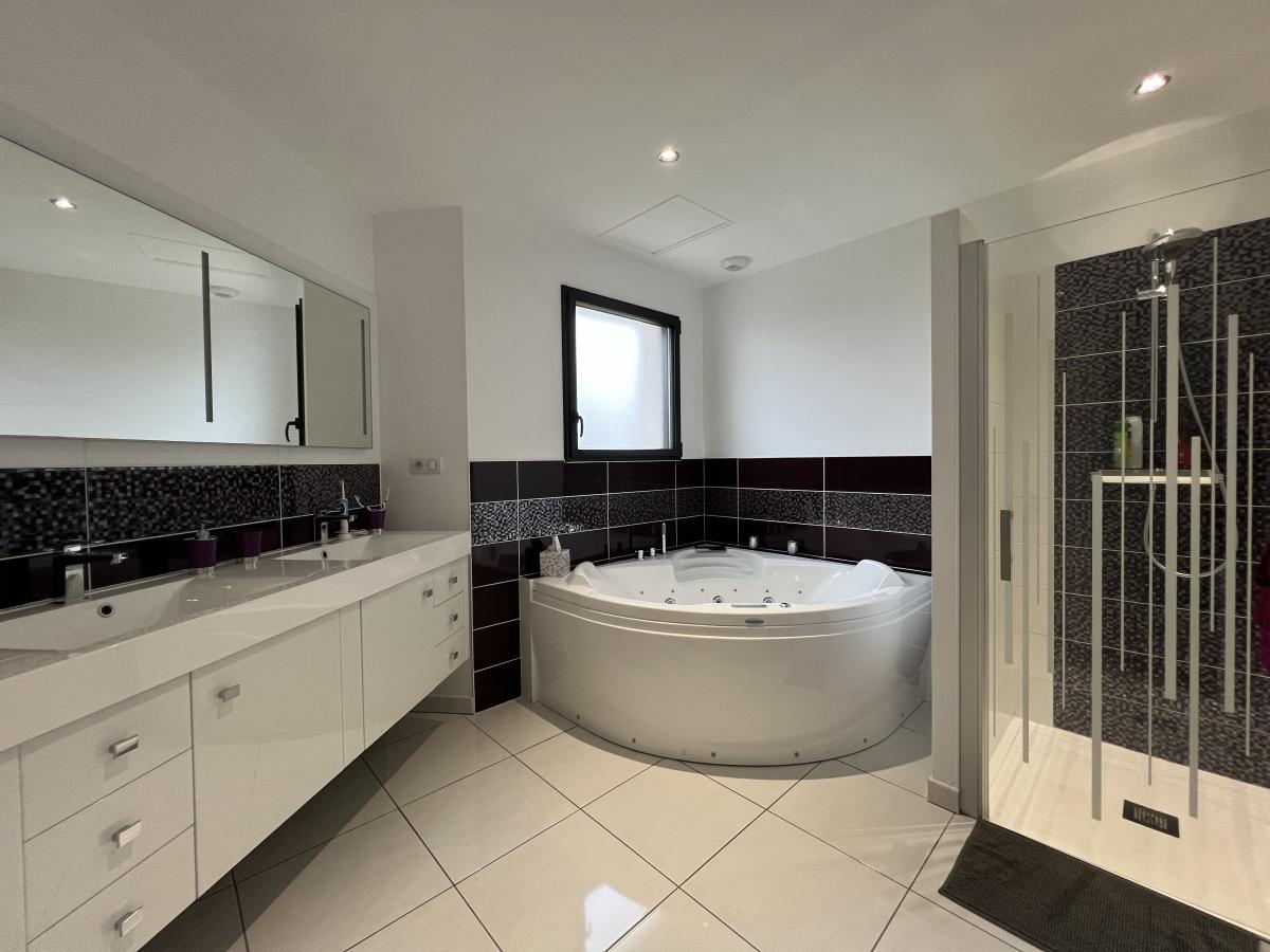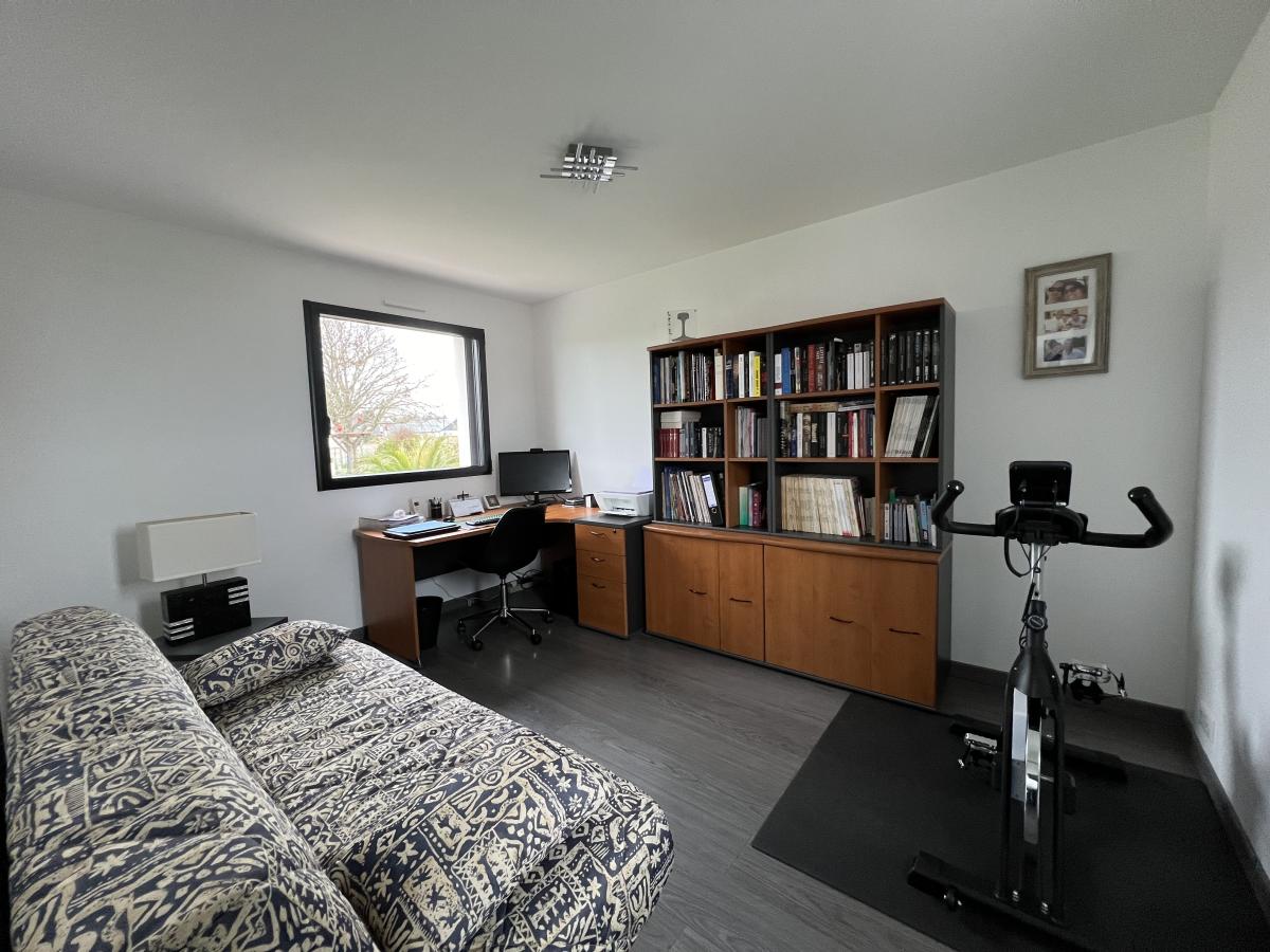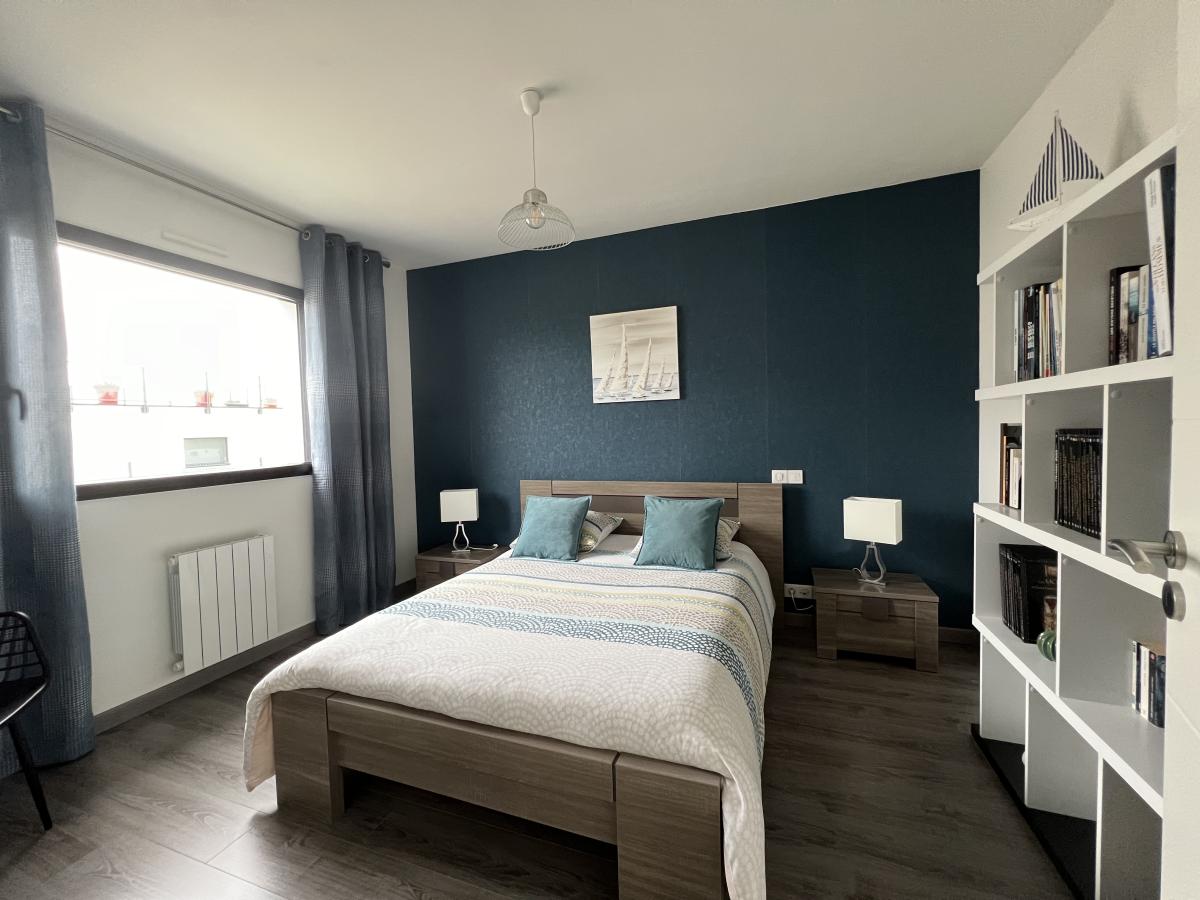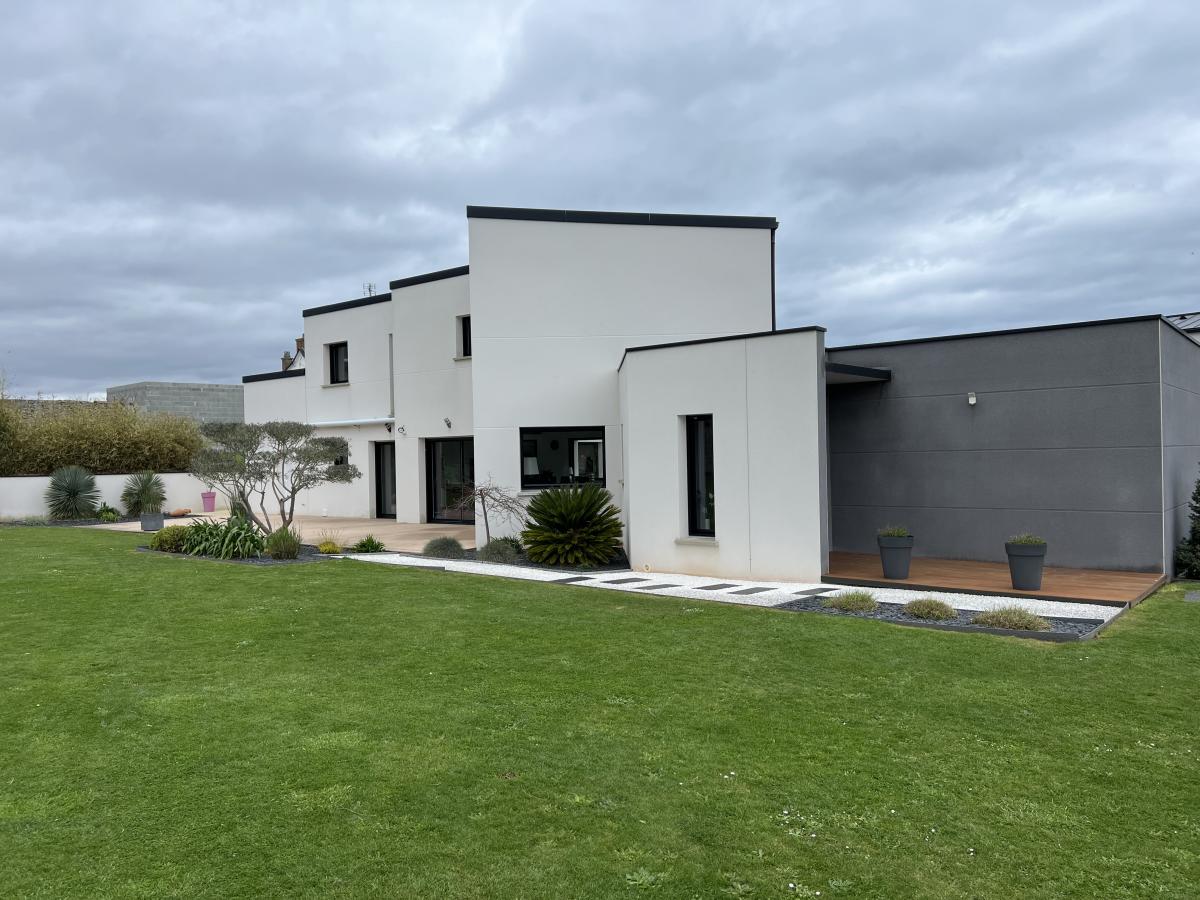 TREVENEUC - côté Mer, Maison contemporaine de 2013 sur terrain de 1823 m², comprenant : Hall d'entrée avec placard, wc avec lave-mains, suite parentale : sas avec placards, salle d'eau, chambre, cuisine aménagée et équipée ouverte sur séjour-salon VUE MER, arrière-cuisine aménagée, chaufferie, garage double. A l'étage : palier, trois chambres dont deux avec VUE MER, salle de bains baignoire et douche, wc. Terrasse, garage double, jardin paysagé, chauffage géothermie, proche mer.