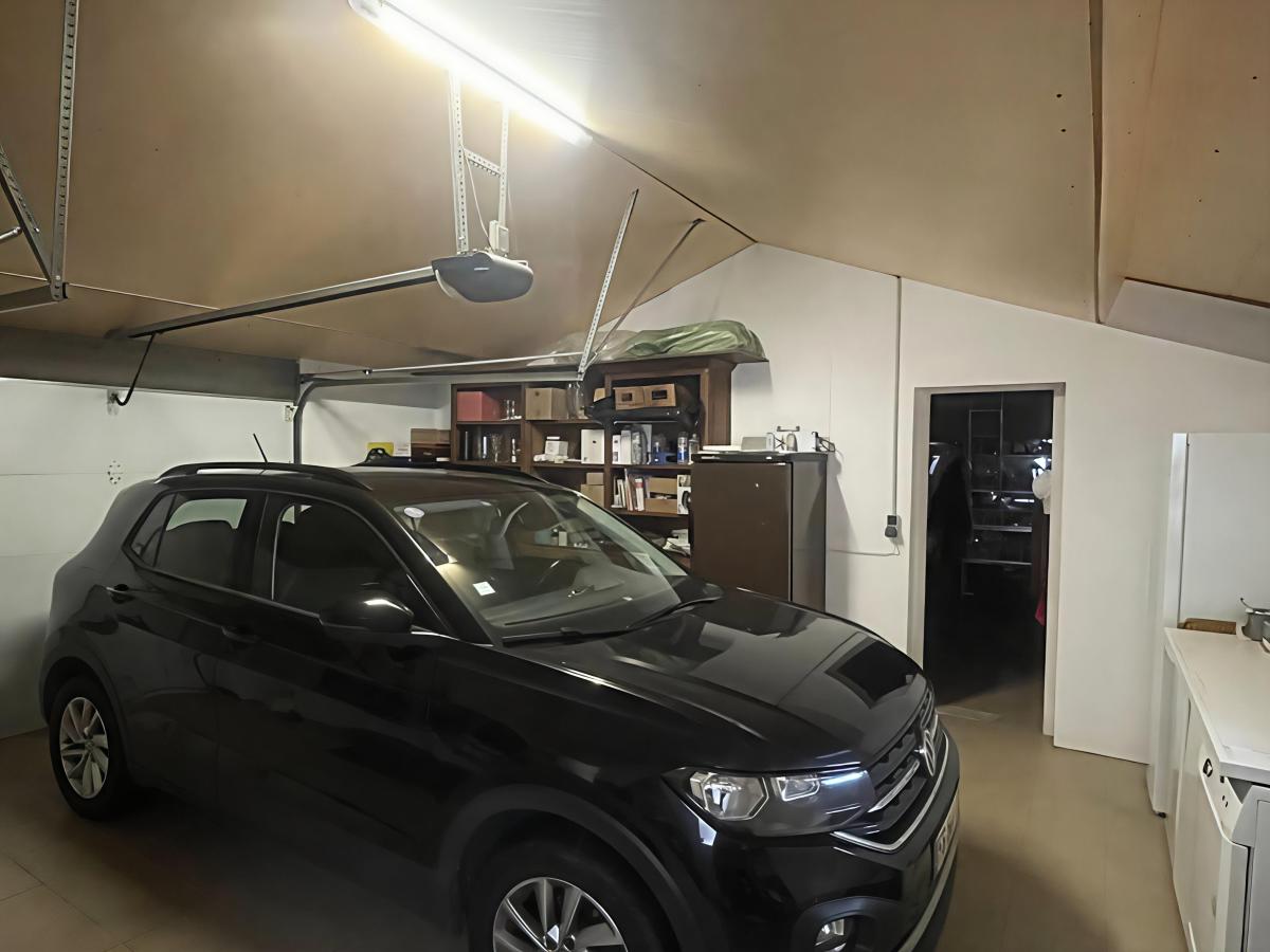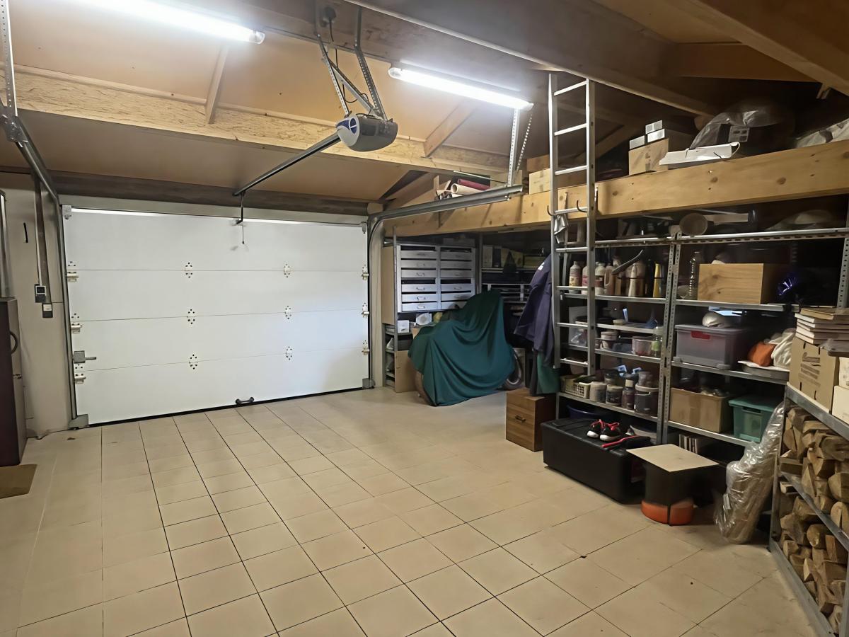 Un double garage carrelé et isolé, dont une partie aménagée en atelier, un débord de toit faisant office de préau.
