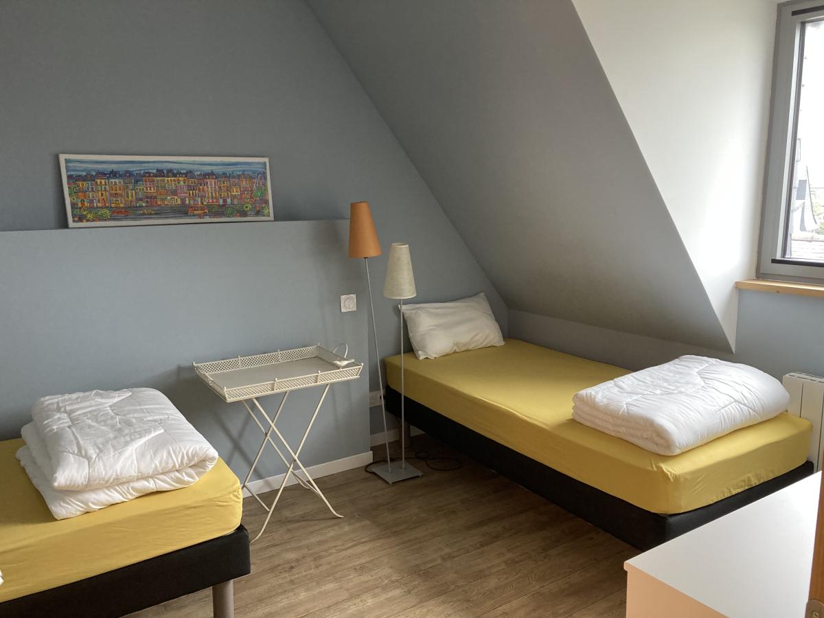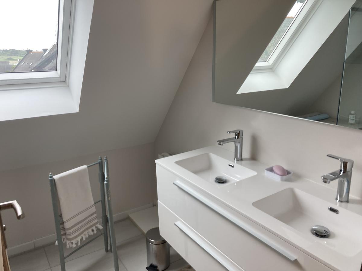À l’étage, un palier dessert deux chambres, une salle d’eau et des WC indépendants.