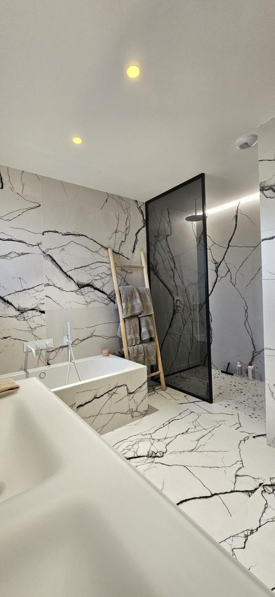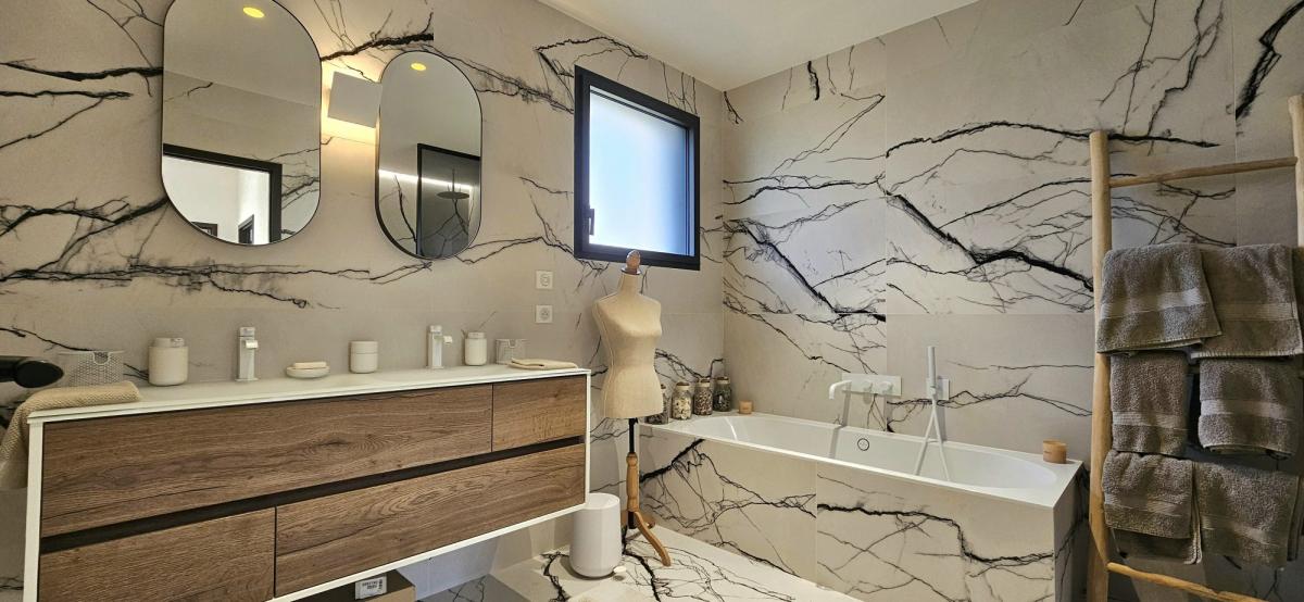 Ce niveau comprend également deux chambres, une salle d’eau tout en marbre noir, avec douche à l’italienne et double vasque. , un WC indépendant avec lave-mains, une buanderie ainsi qu’un espace technique intégrant pompe à chaleur, ballon thermodynamique, domotique et réseau internet. Un garage complète l’ensemble.