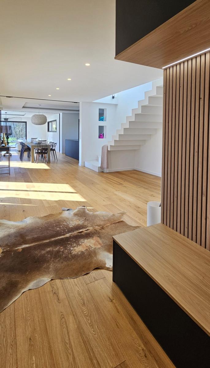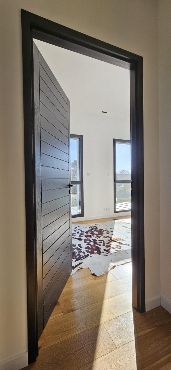 L’ensemble de la maison est équipé de parquets massifs et de larges ouvertures offrant une belle luminosité dans chaque pièce.
