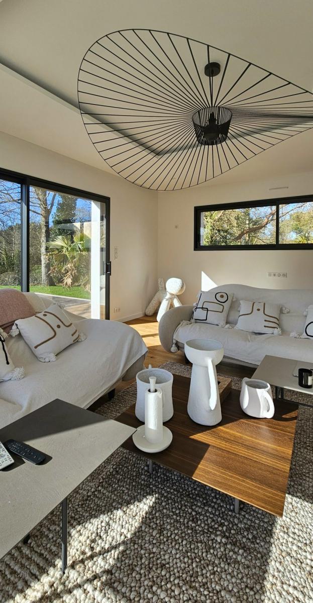 Construite en 2023, cette maison offre un cadre de vie ouvert sur la nature. Elle est entourée d’une terrasse en bois exotique d’environ 250 m². Une piscine chauffée par pompe à chaleur, sera achevée pour la vente. Un abris de jardin en dur, et un carport sont installés côté nord.