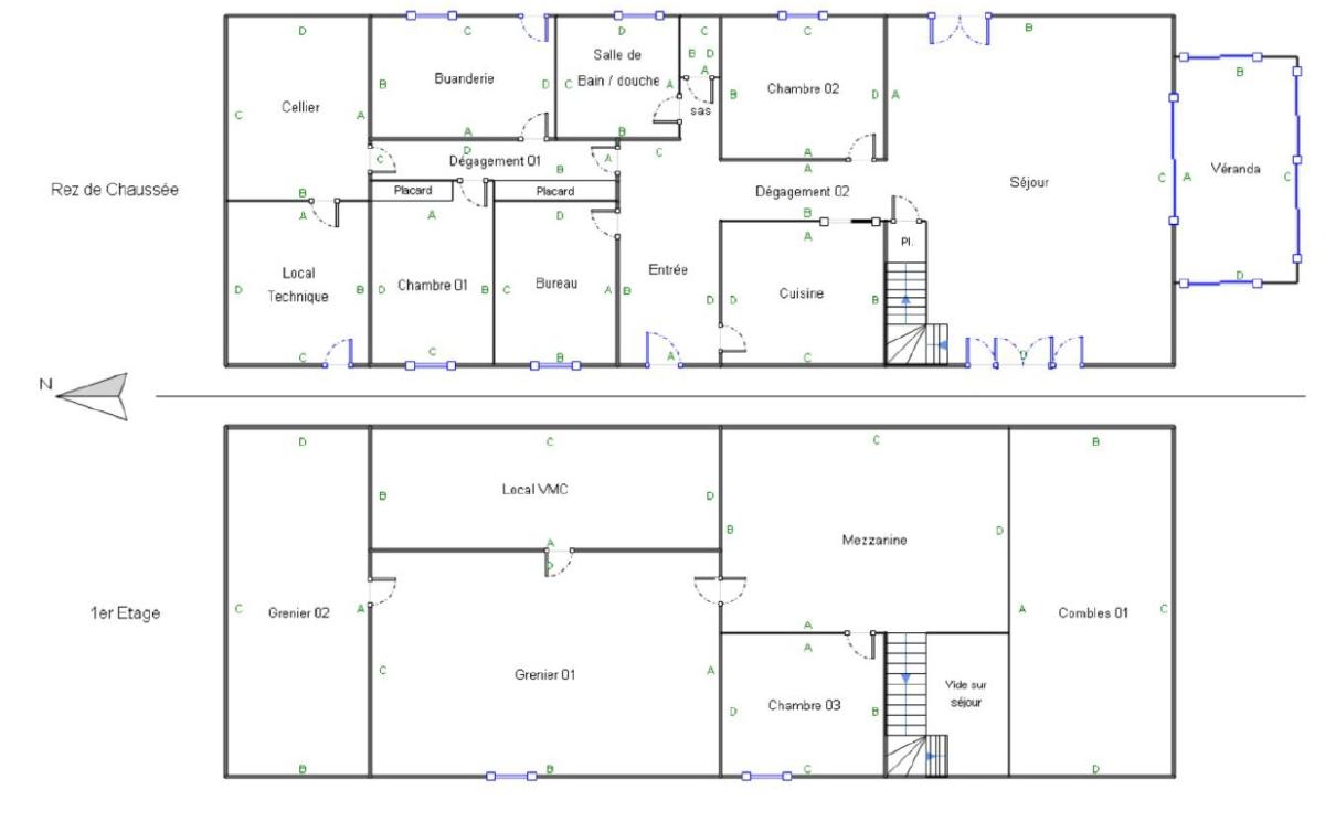 - Au rez-de-chaussée : entrée, cuisine, séjour (62 m²) avec cheminée et monte charge (accès cave), bureau ou chambre, 2 chambres, salle de bains avec douche, W.C, buanderie/chaufferie, 2 celliers dont 1 avec monte charge (accès étage), véranda avec store électrique sur la toiture.