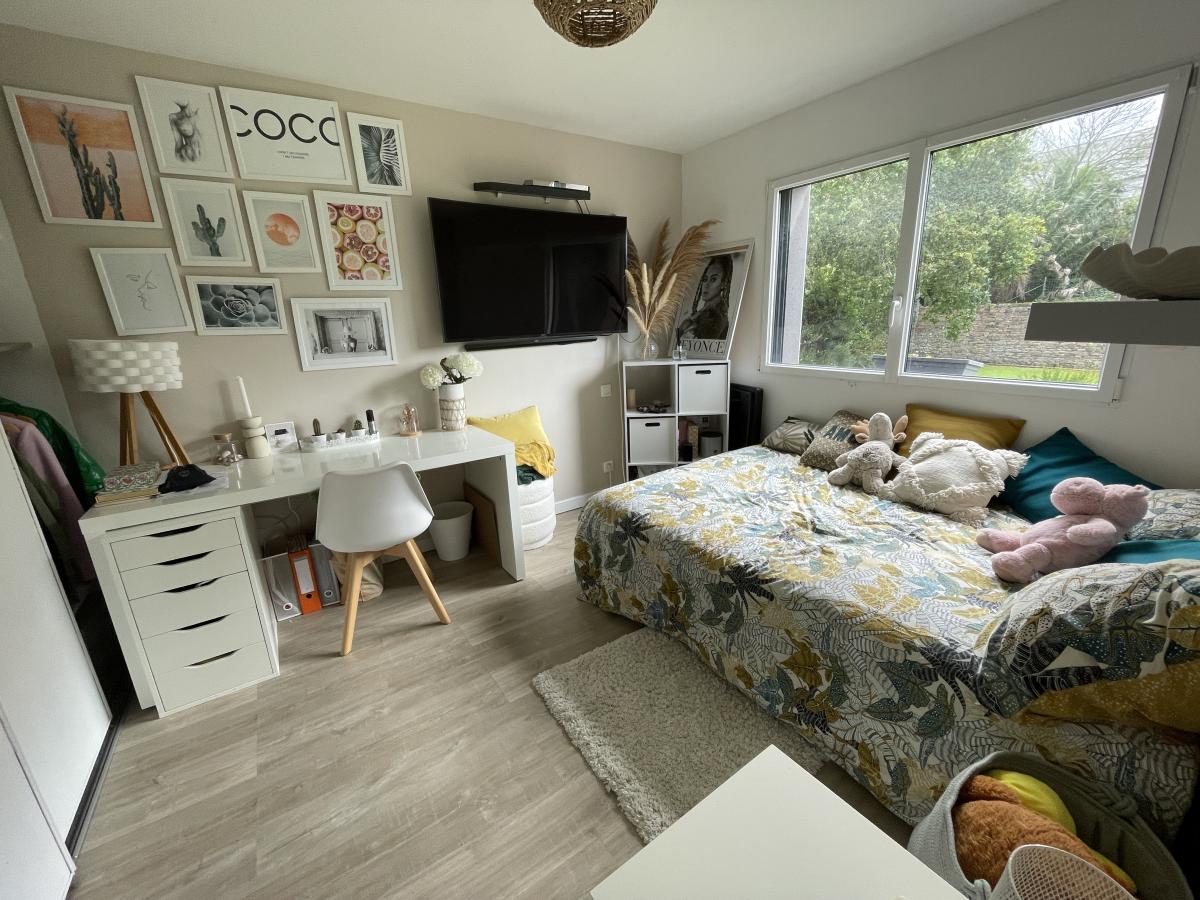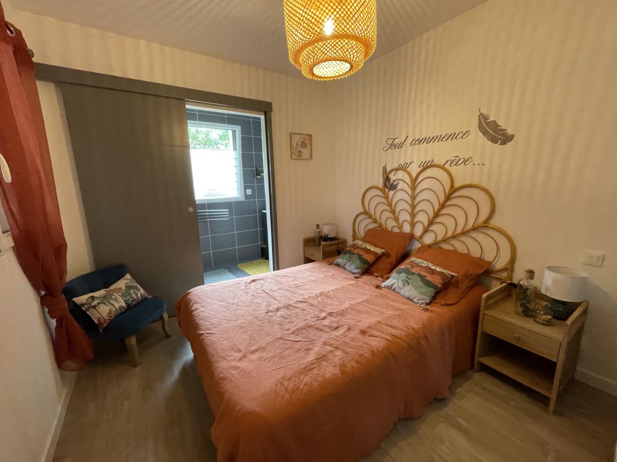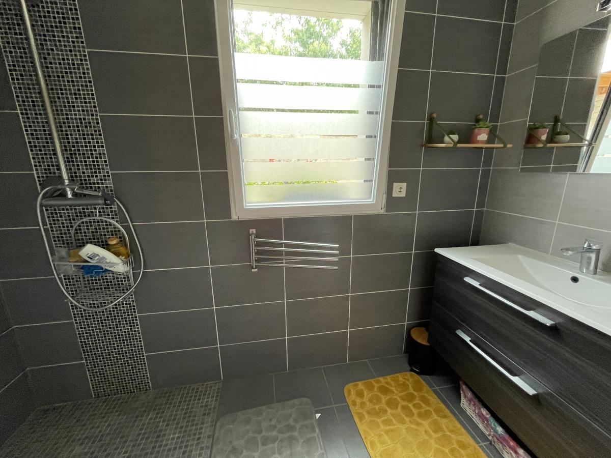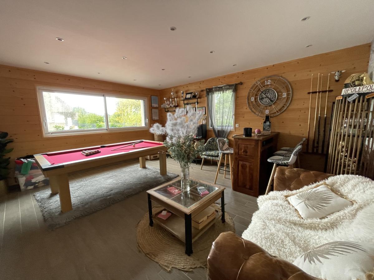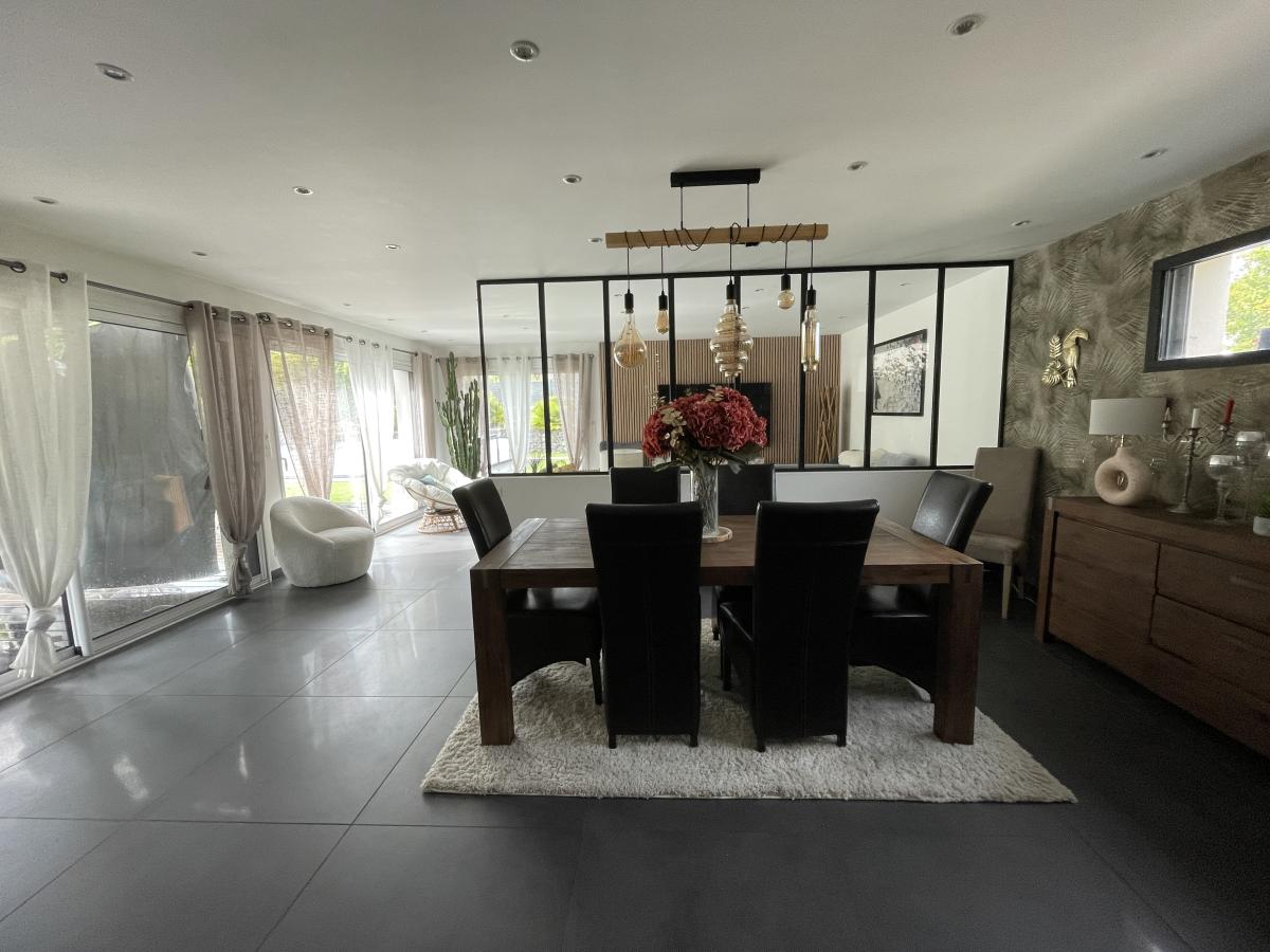 RDC: Entrée avec rangements, grande cuisine aménagée équipée, vaste séjour-salon avec verrière et baies vitrées donnant sur terrasse et jardin, cellier, wc, une chambre avec dressing, bureau et salle d’eau privative, autre chambre avec salle d’eau attenante. Salle de jeux et de détente de 25 M2. Carport. Garage.