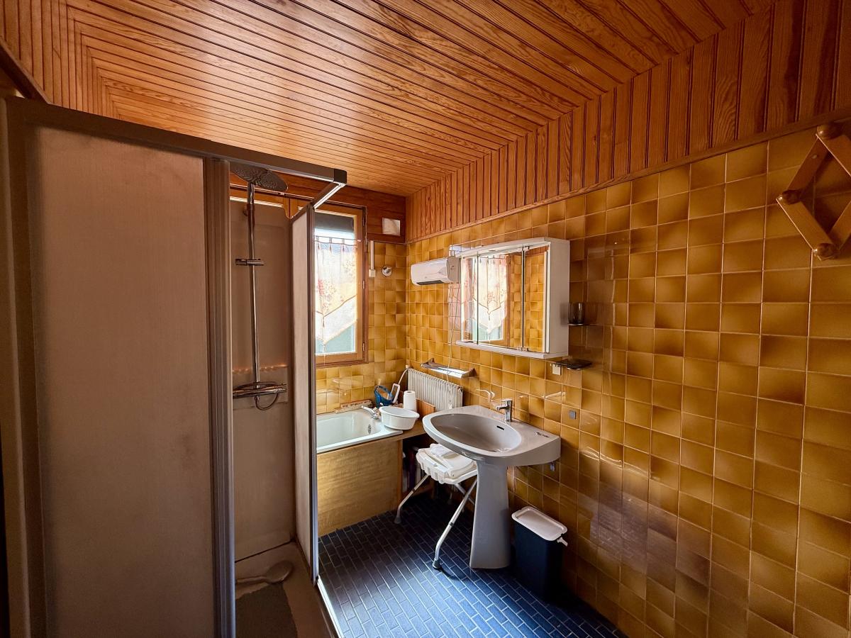 Au rez-de-chaussée, un hall d’entrée, wc, une cuisine aménagée, un couloir de dégagement, une salle de bains avec une baignoire, une vasque et une douche cabine. Dans le prolongement, deux chambres dont une avec un petit espace de rangement et pour compléter l'ensemble un salon/séjour équipée d'un insert bois et bénéficiant d'un balcon terrasse.