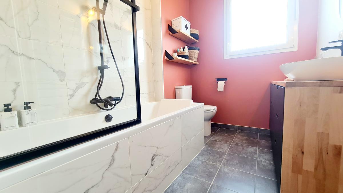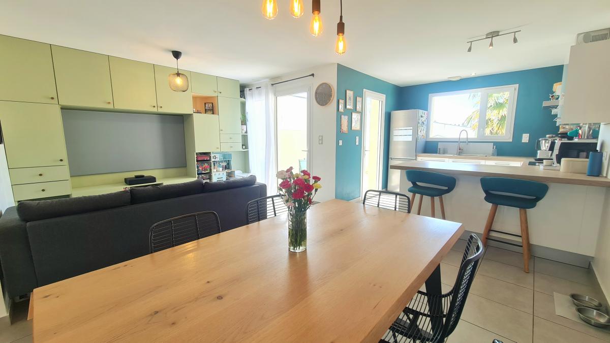 Maison récente de 2015 sur un terrain de 218 m², maison de Type 5 de 79 m² avec en annexe un garage de 16 m² environ, une cour pour stationner 2 véhicules devant la maison et une terrasse.