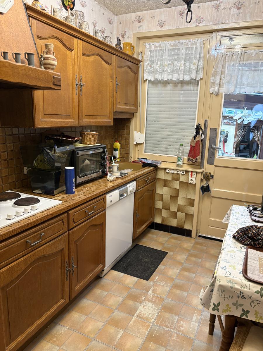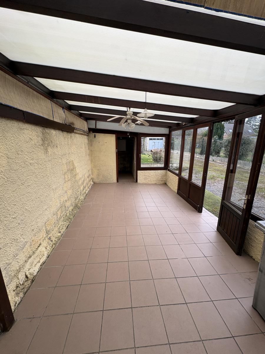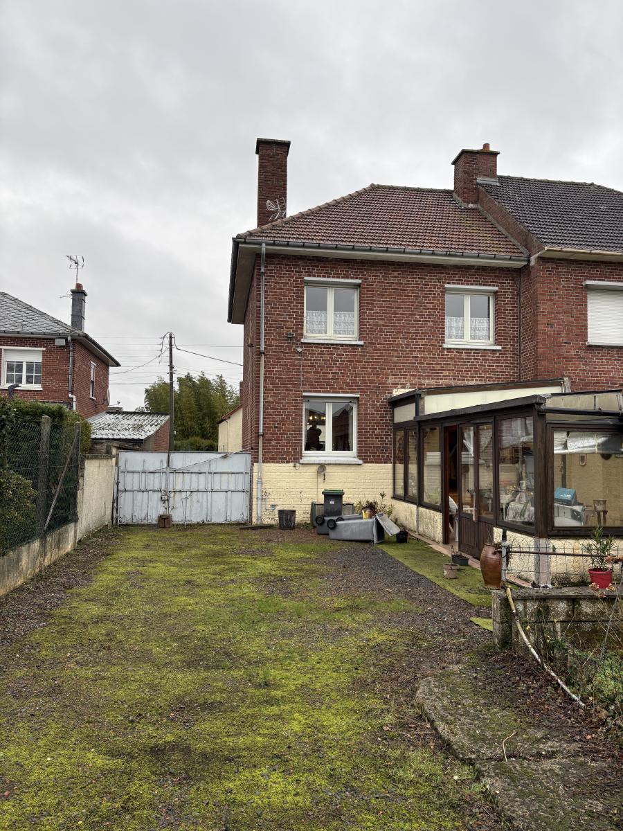 Agréable maison, Semi mitoyenne, disposant au rez-de-chaussée d’un couloir d’entrée, d’un WC, d’un salon, d’une salle à manger, d’une cuisine rustique aménagée et d’une véranda donnant sur le jardin. Quant à l’étage, il comprend un palier, trois chambres, une salle de bain et grenier.