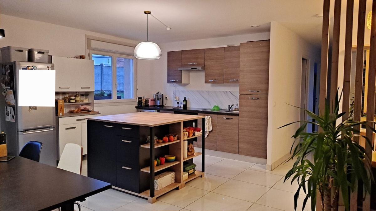 Elle comprend une cuisine équipée ouverte sur salon-séjour, 3 chambres, salle de bains, garage, et jardin.