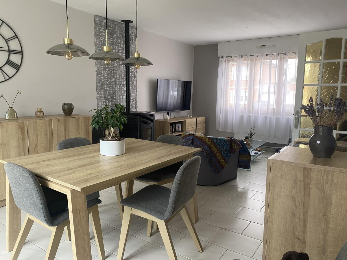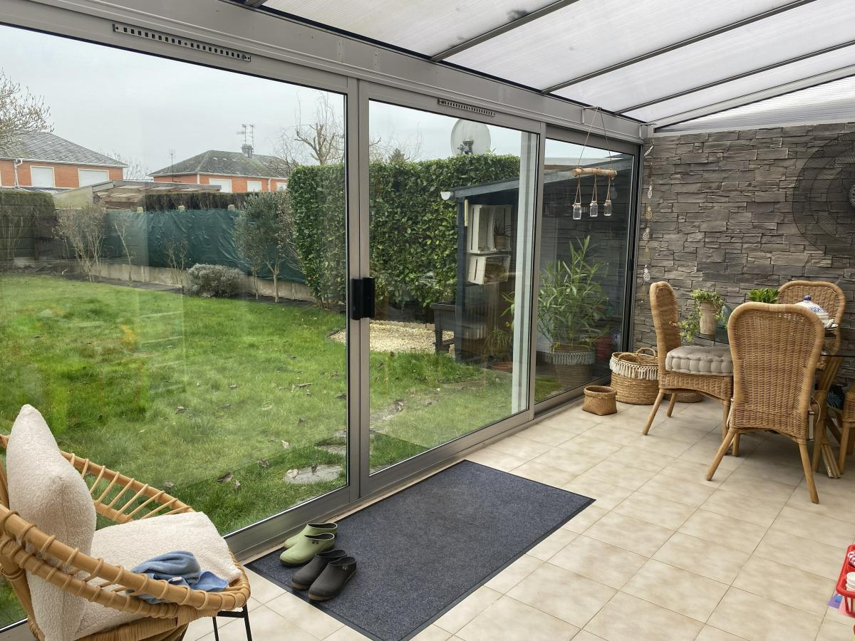 VITRY-EN-ARTOIS - Maison de résidence semi-mitoyenne comprenant : s/cave - RDC : entrée, WC, cuisine équipée, séjour-salon avec poêle à pellets, véranda - Etage : palier, 3 chambres dont 2 avec placards, salle de bains - C/C gaz - Garage avec abri sur l'arrière - Jardin - S/368 m²