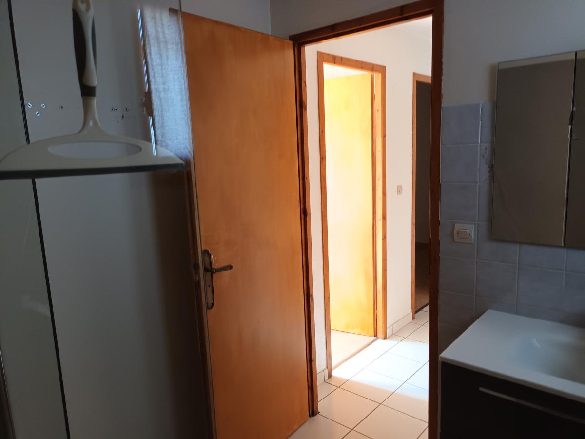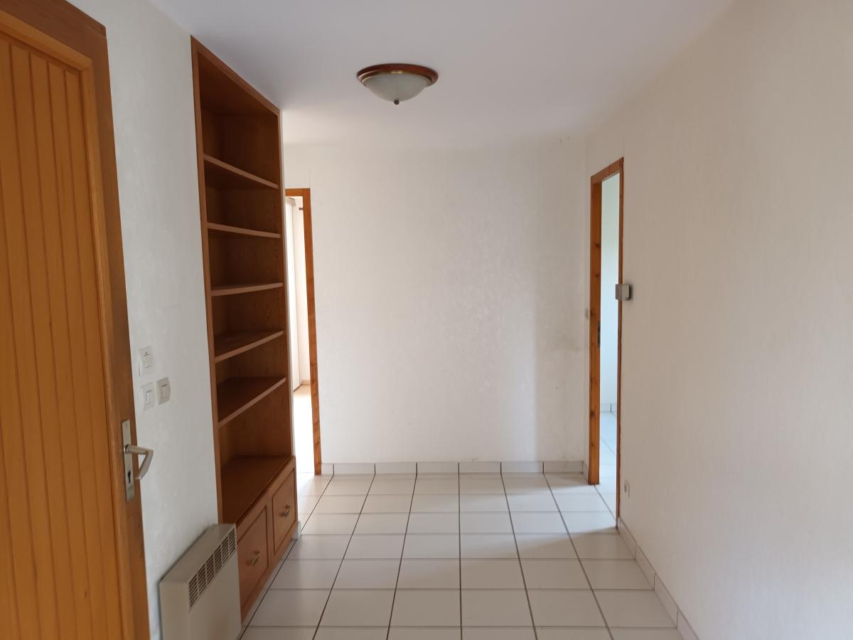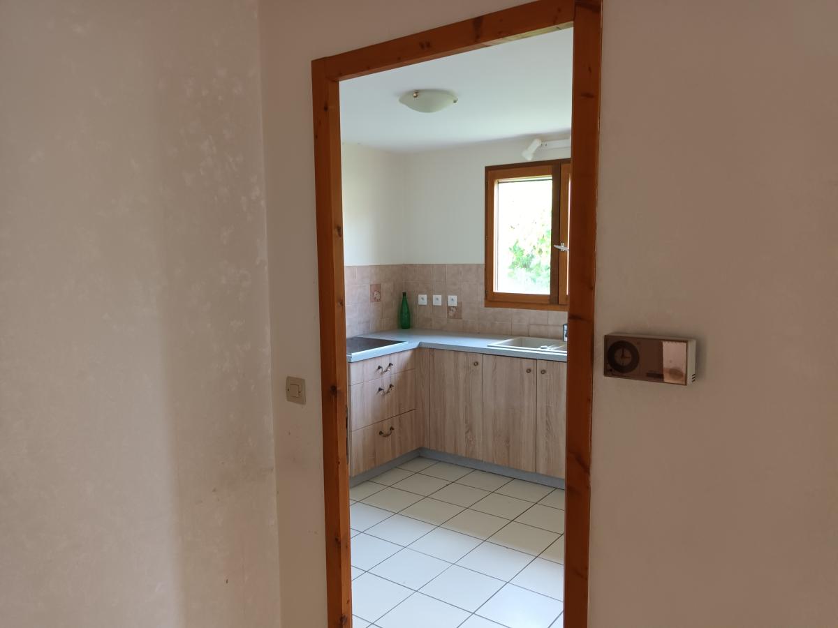 Entrée dans hall desservant un salon / salle à manger, une cuisine fermée, deux chambres, une buanderie, une salle de d’eau avec douche à l’italienne et un WC.