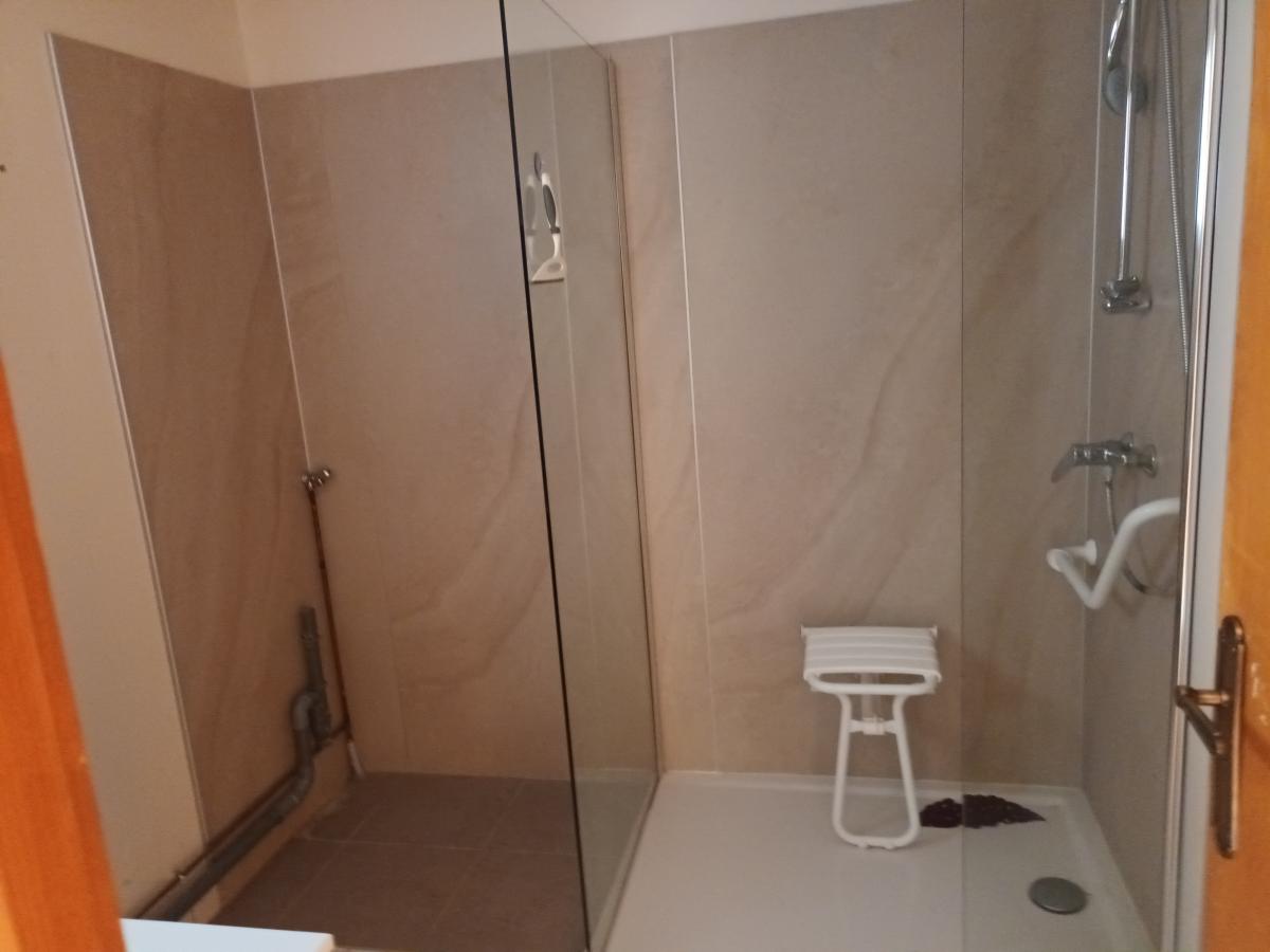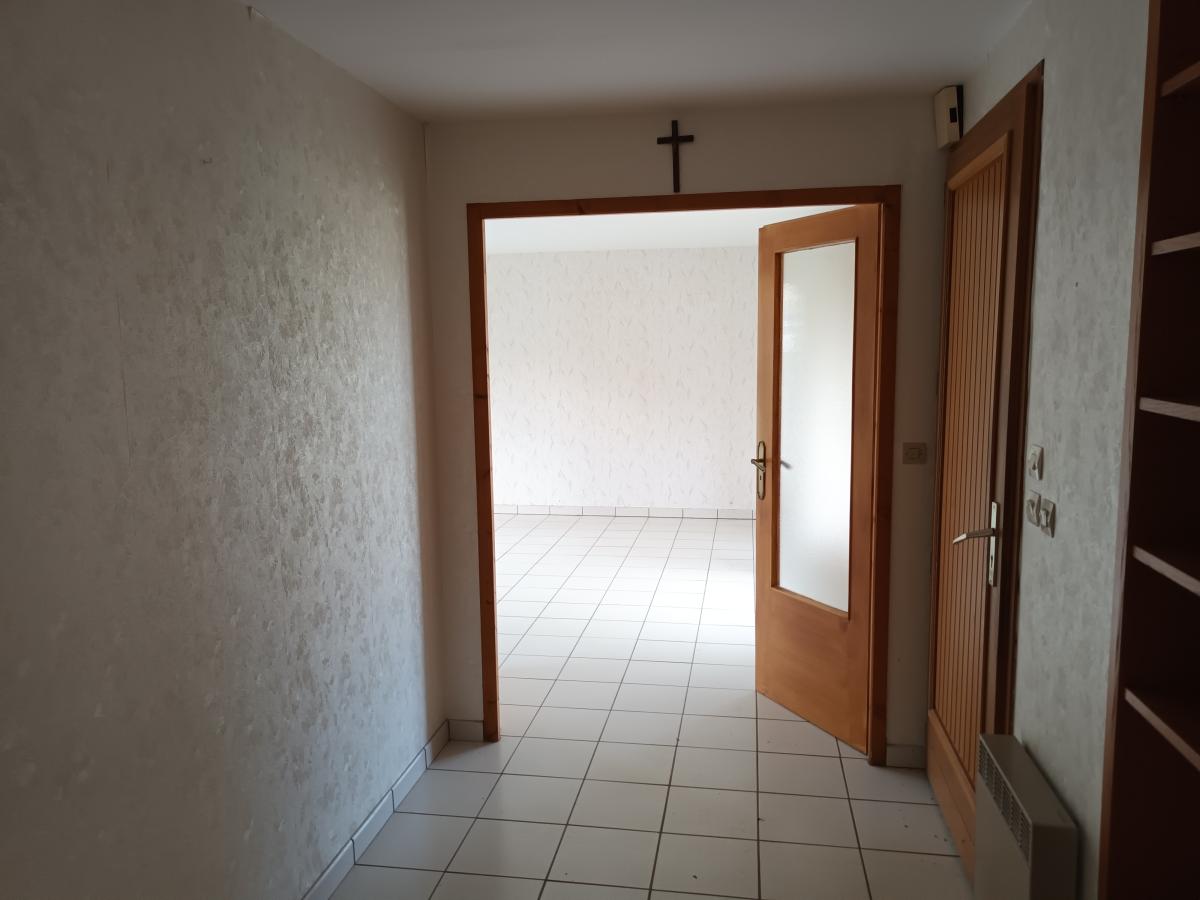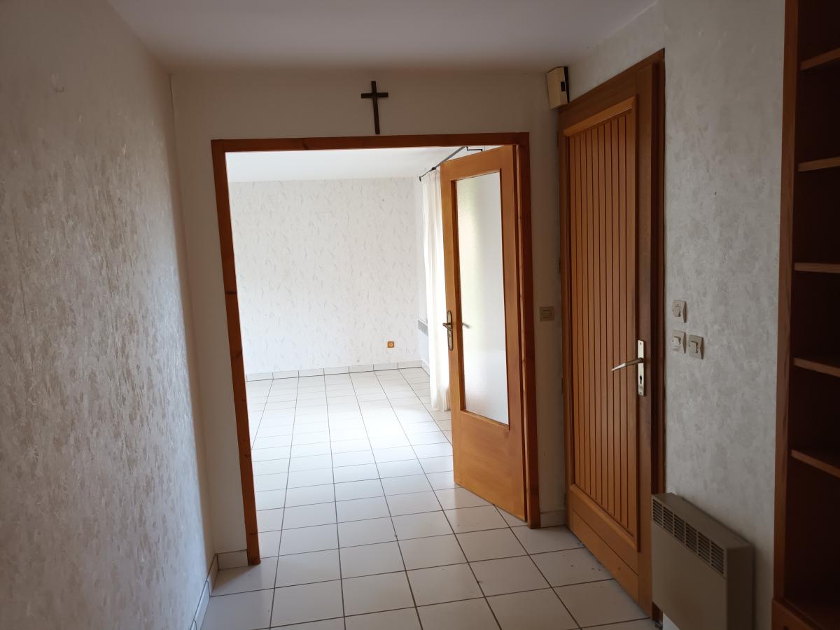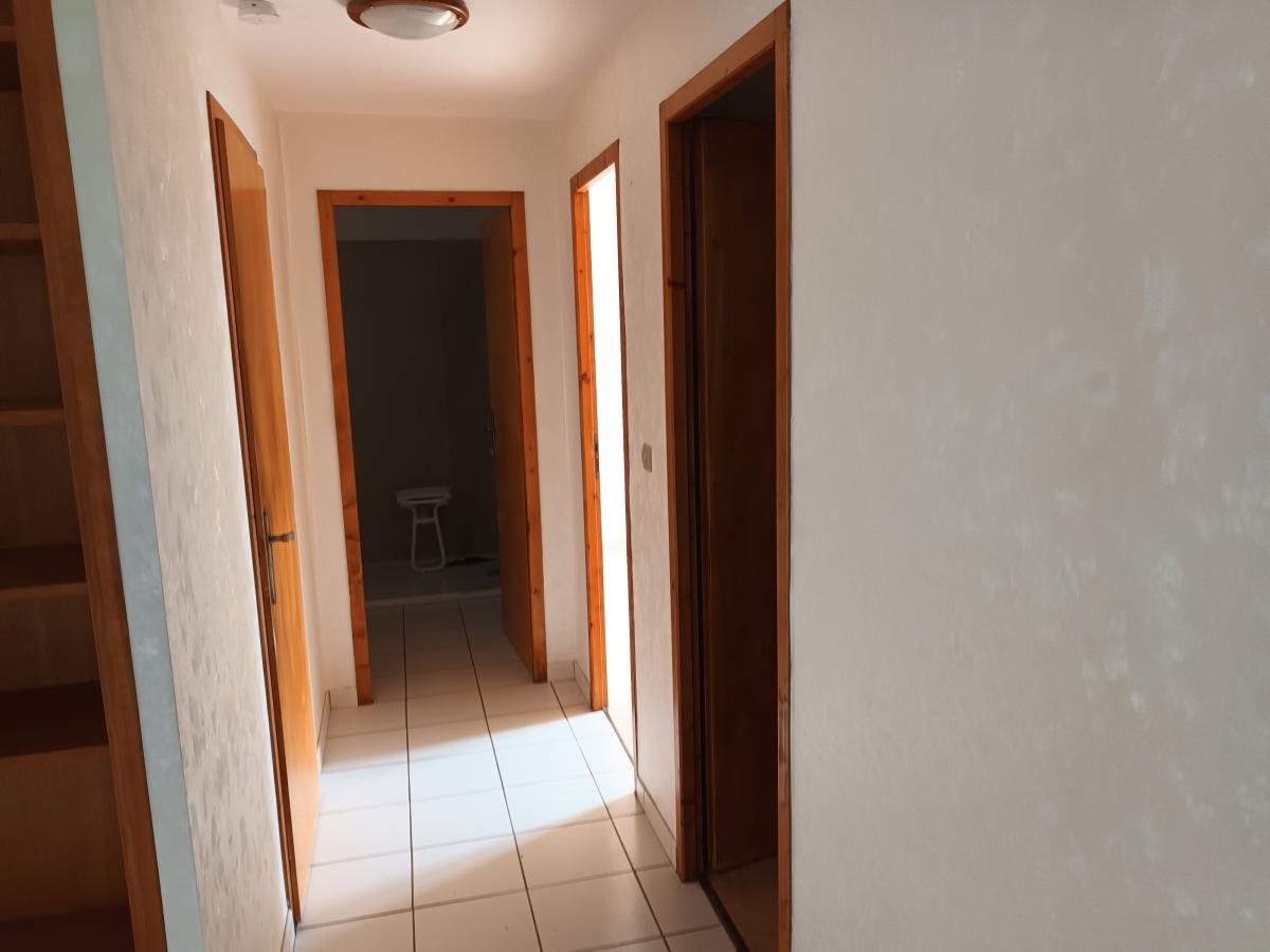 Entrée dans hall desservant un salon / salle à manger, une cuisine fermée, deux chambres, une buanderie, une salle de d’eau avec douche à l’italienne et un WC.