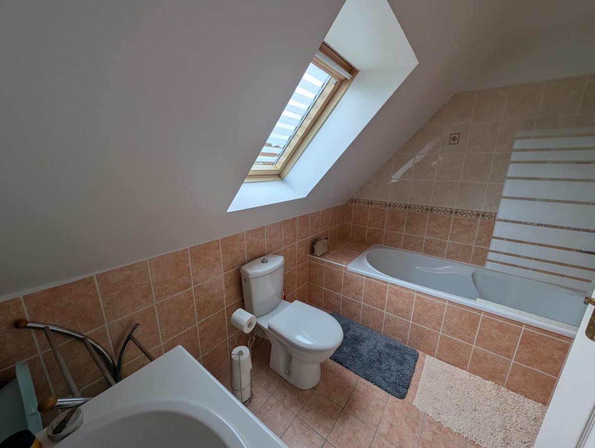À l’étage, le palier dessert trois chambres mansardées ainsi qu’une salle de bains avec WC,