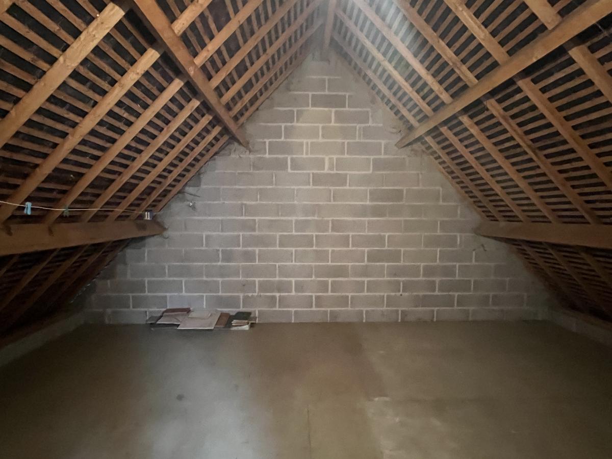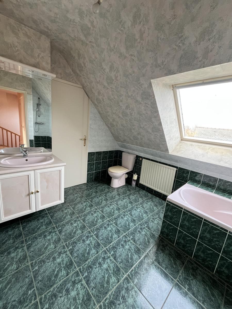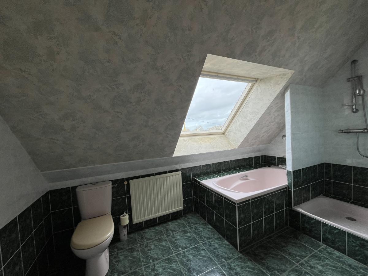 - Etage : palier desservant deux chambres, salle d'eau avec baignoire, douche et WC, grenier aménageable, offrant la possibilité de créer une quatrième chambre.
