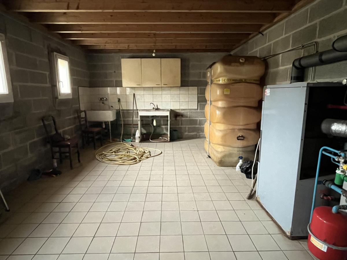 - Rez-de-chaussée : entrée ouverte sur la salle à manger et cuisine en partie aménagée, salon avec une cheminée-insert, chambre, salle d'eau, WC, rangements.