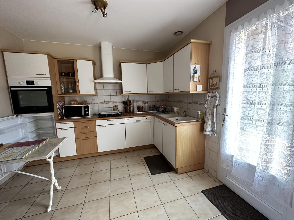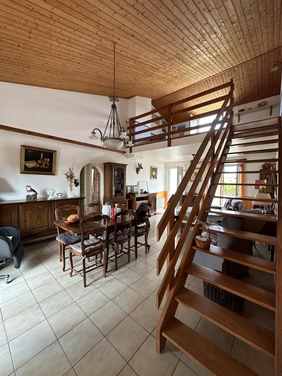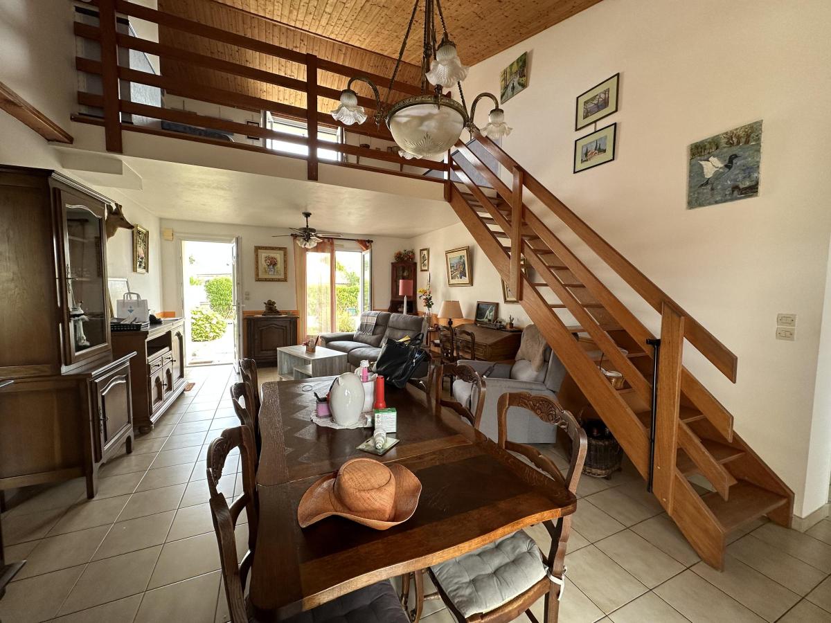 Elle est composée d'un séjour/salon avec mezzanine, une cuisine aménagée, deux chambres, WC, salle d'eau. Garage. Terrasse donnant sur un jardin clos.
