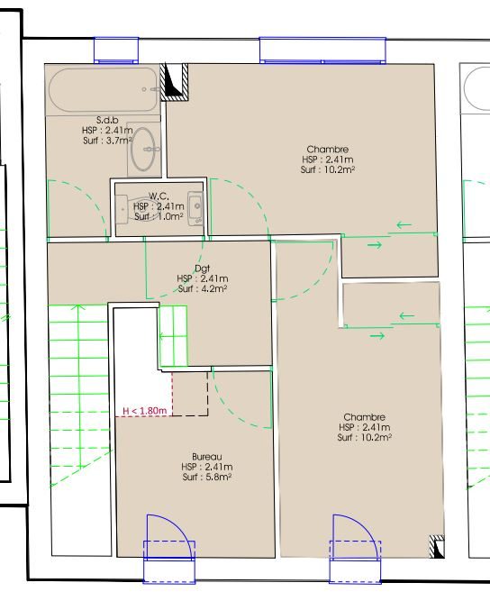 Au 1er étage : palier, chambre 1, chambre 2, bureau, salle d’eau, WC séparés.