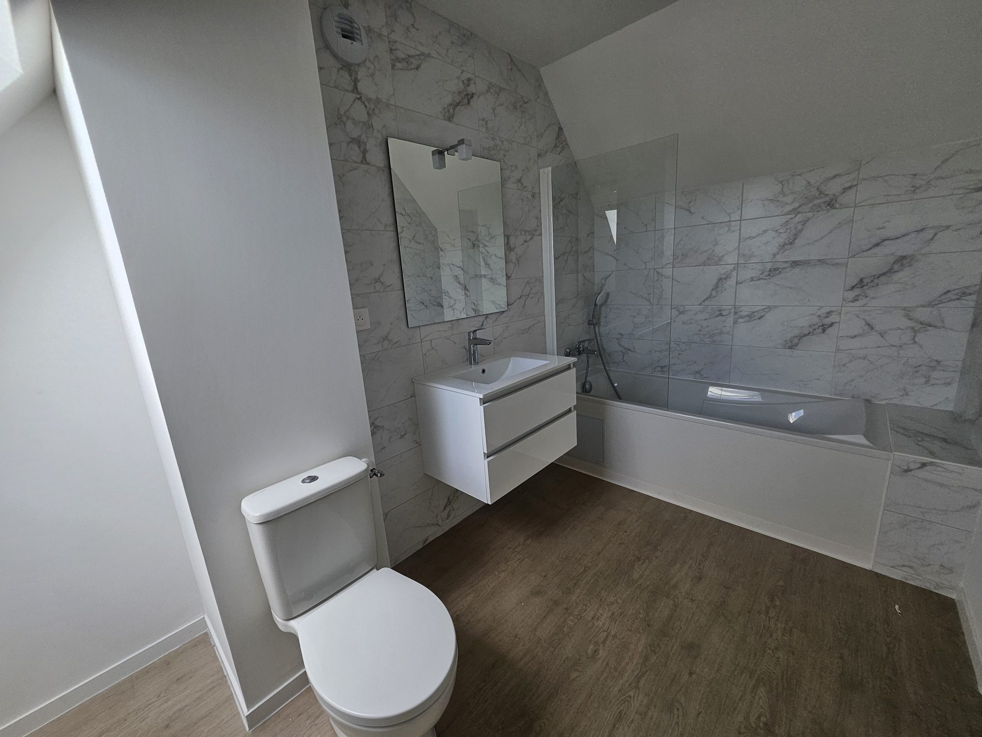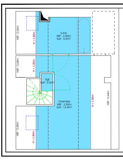 Combles : palier, une chambre mansardée et salle de bains avec WC.