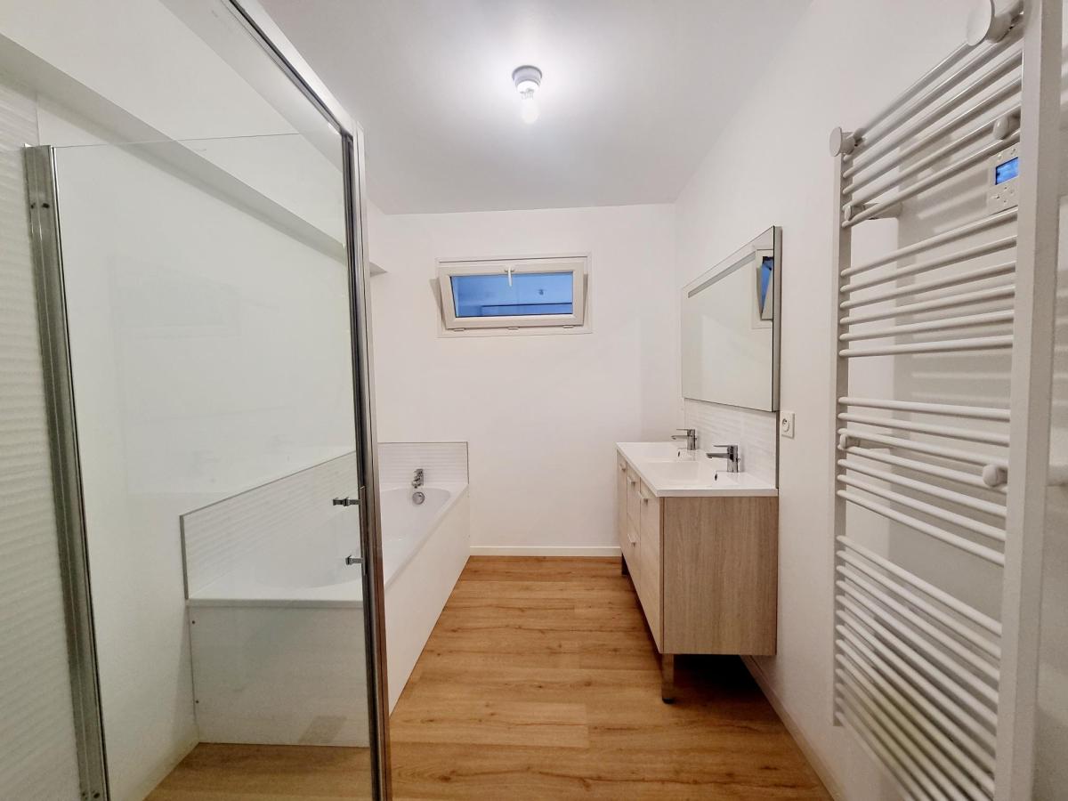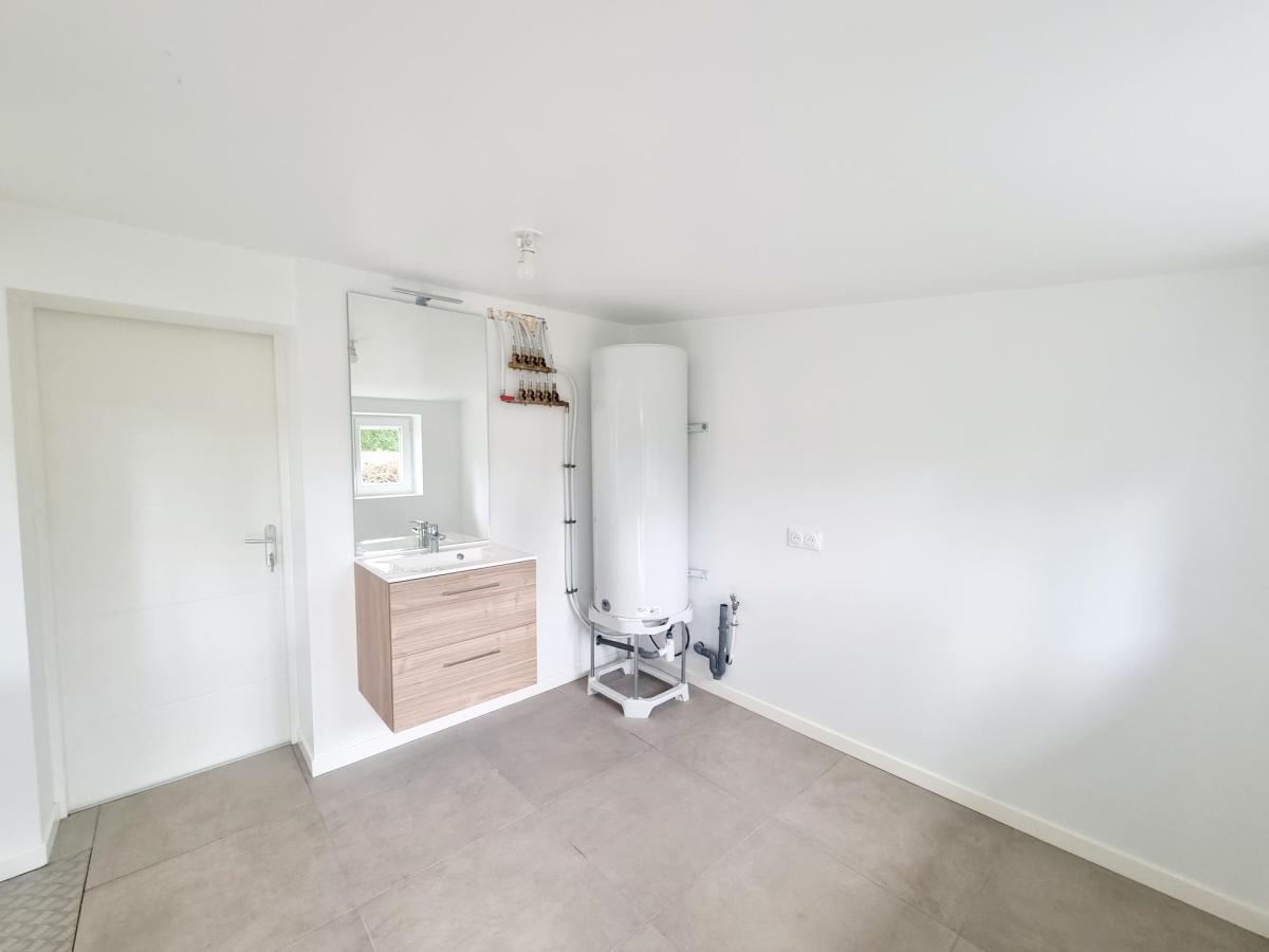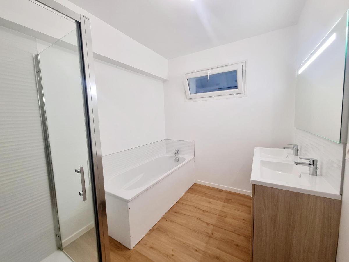 Cette belle maison d'une surface de 92m² habitables offre une entrée, un salon séjour de 25m² ouvert sur une cuisine meublée et équipée neuve de 14m², une salle de bains avec douche, baignoire et meuble double vasque, grand cellier avec meuble vasque, WC.