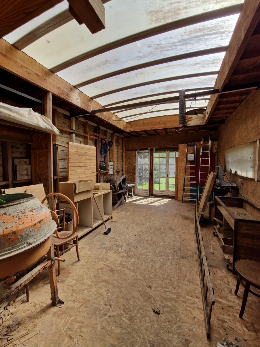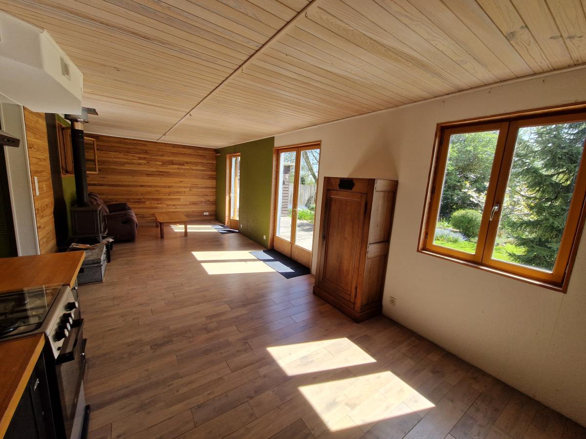 - au rez-de-chaussée : une entrée avec un escalier, une cuisine ouverte sur le salon/séjour avec un poêle à bois, une chambre, une salle de bain/buanderie et un wc.