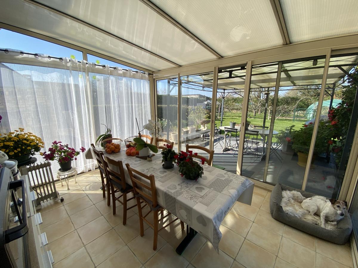 La maison est exposée au sud et offre une vue sur le jardin et la verdure. Elle dispose également d'un sous-sol total, d'un carport pour camping-car, d'un garage, d'abris bois, un atelier.