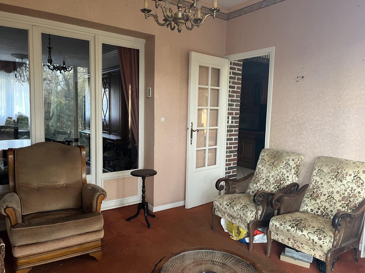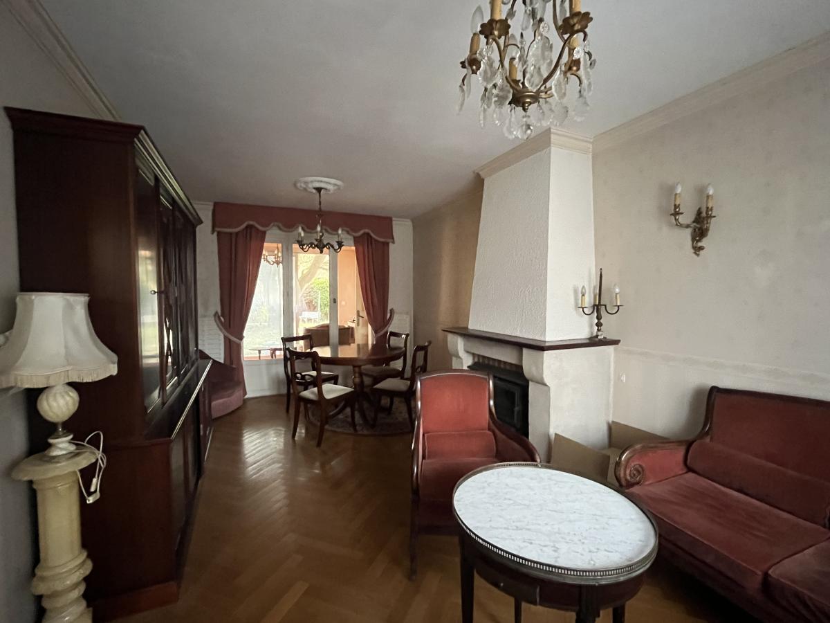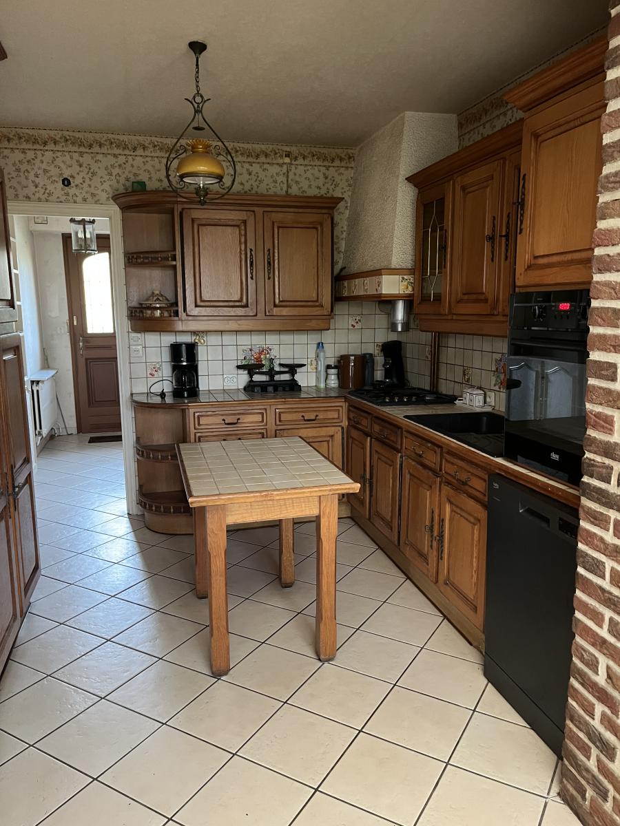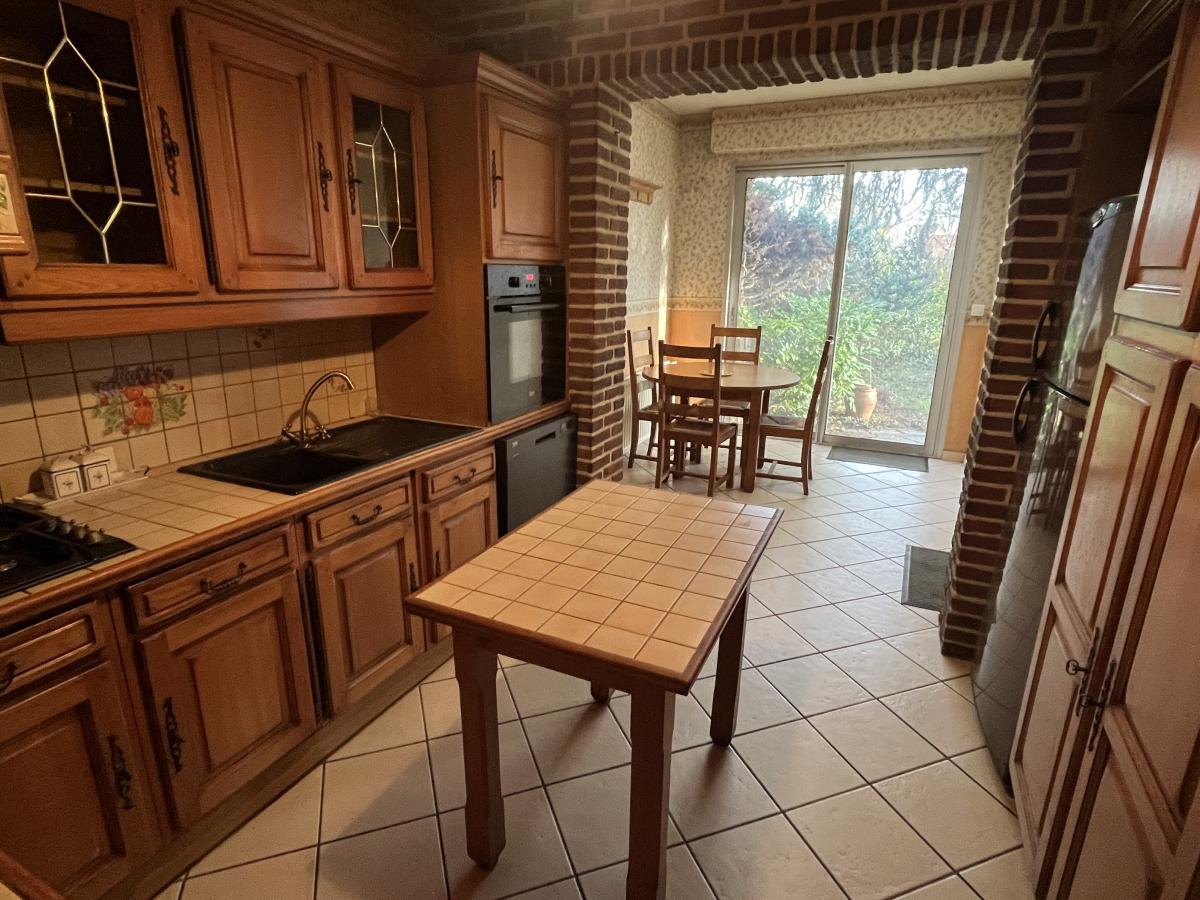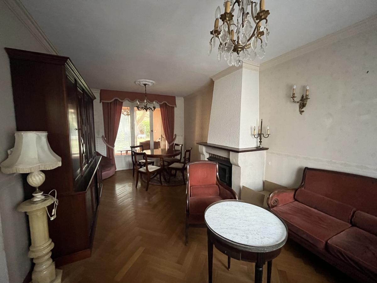 Salon avec cheminée feu de bois (insert) de 30m2, cuisine équipée et espace repas dans le prolongement 17m2 baie sur jardin clos sud-ouest