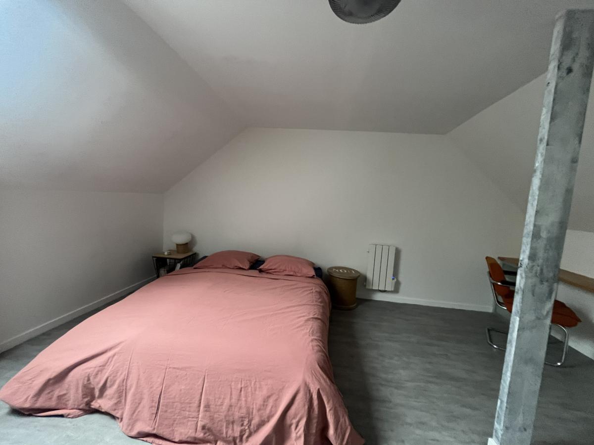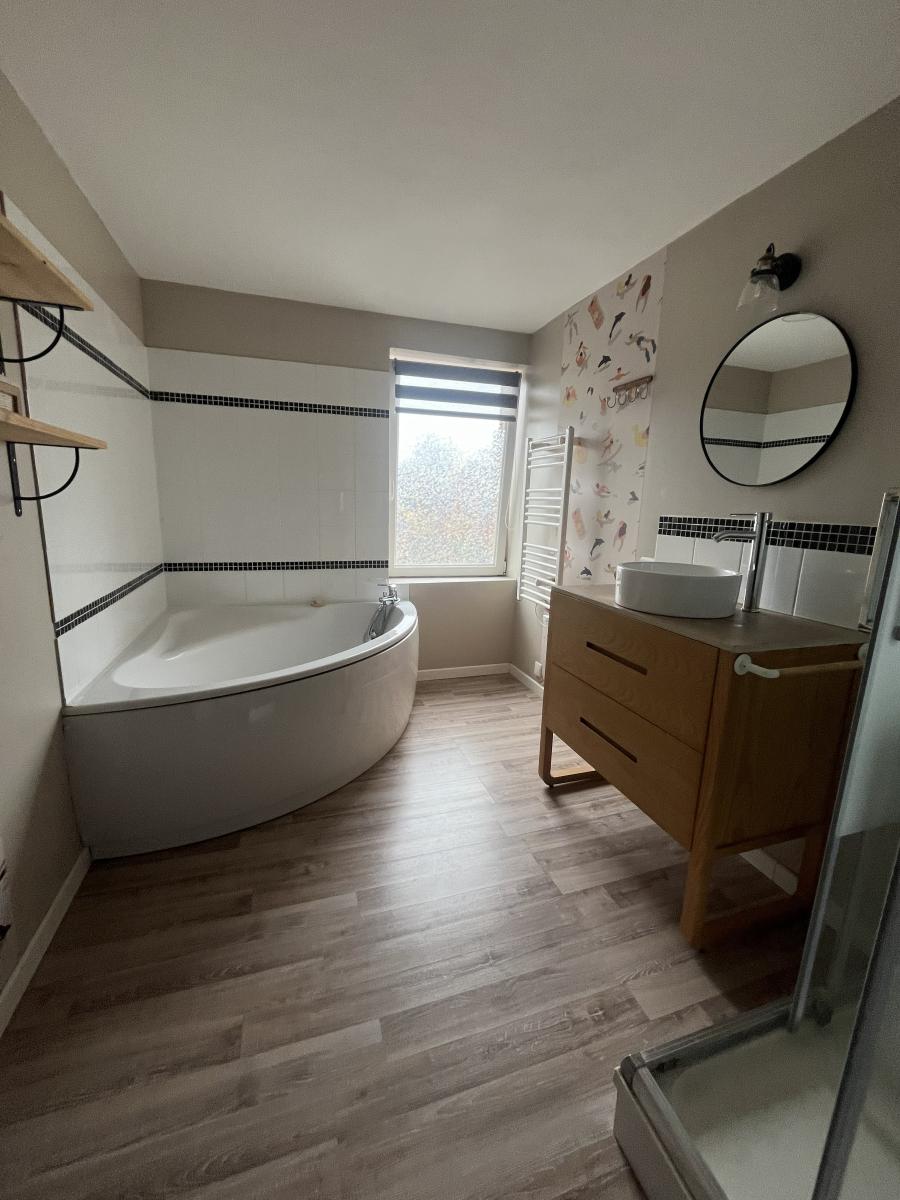 Au premier étage, un palier distribue deux chambres ainsi qu'une salle de bains (avec douche et baignoire) ;